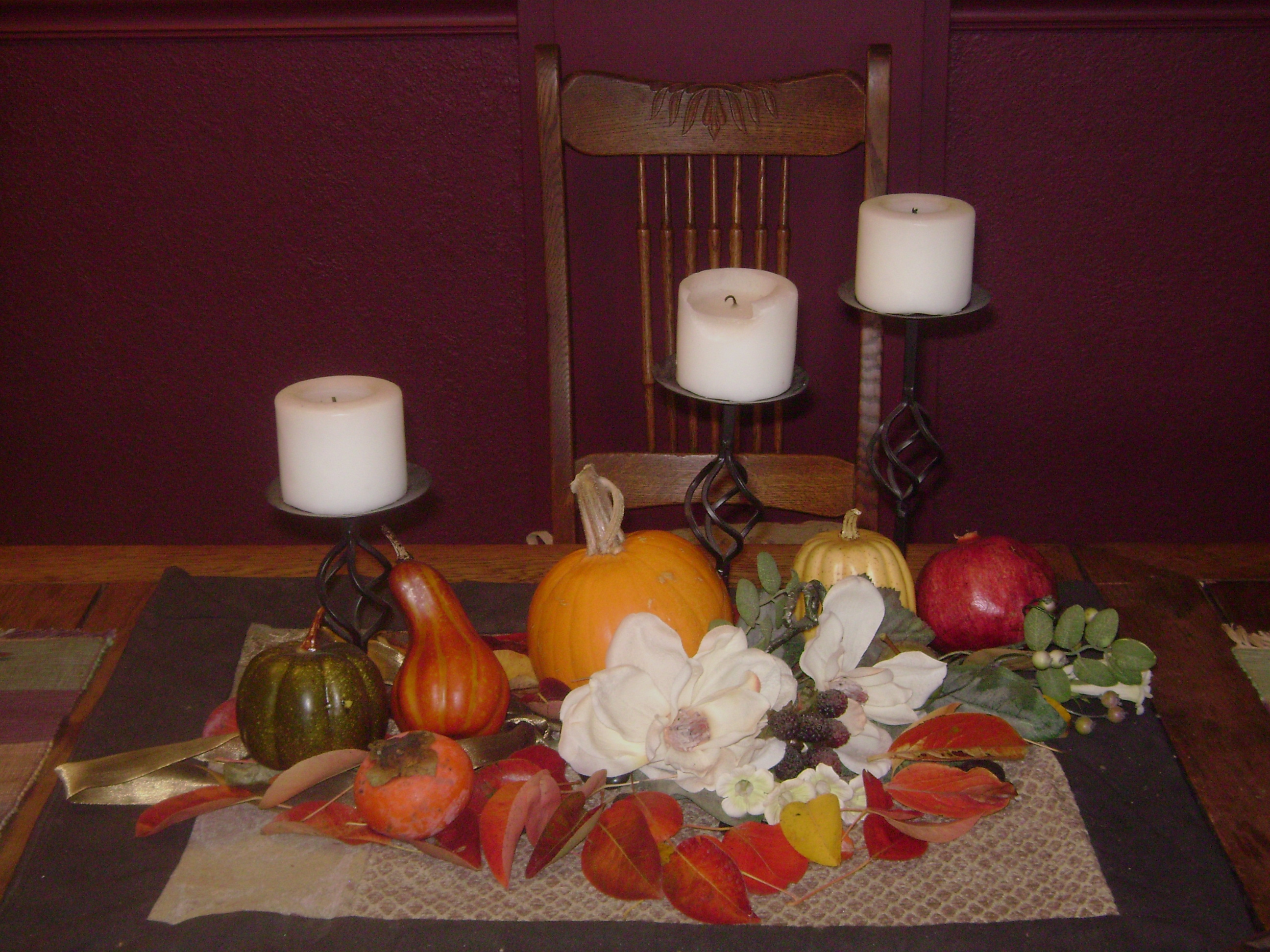 Thanksgiving was a small but good one . I threw these decorations together at the last minute with other decorations my mom had and some leaves from outside. I was thinking that I wish I had brought my knitted pumpkins from my apartment—they would have fit right in: