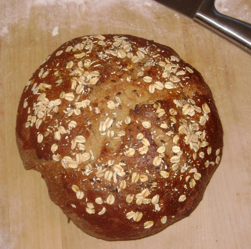 Ok, I will admit I don’t know what recipe was used here! It’s some kind of  round whole wheat bread. I loved the oatmeal and flax seed on top—egg wash is a good way to get them to stick. I think he made this twice.