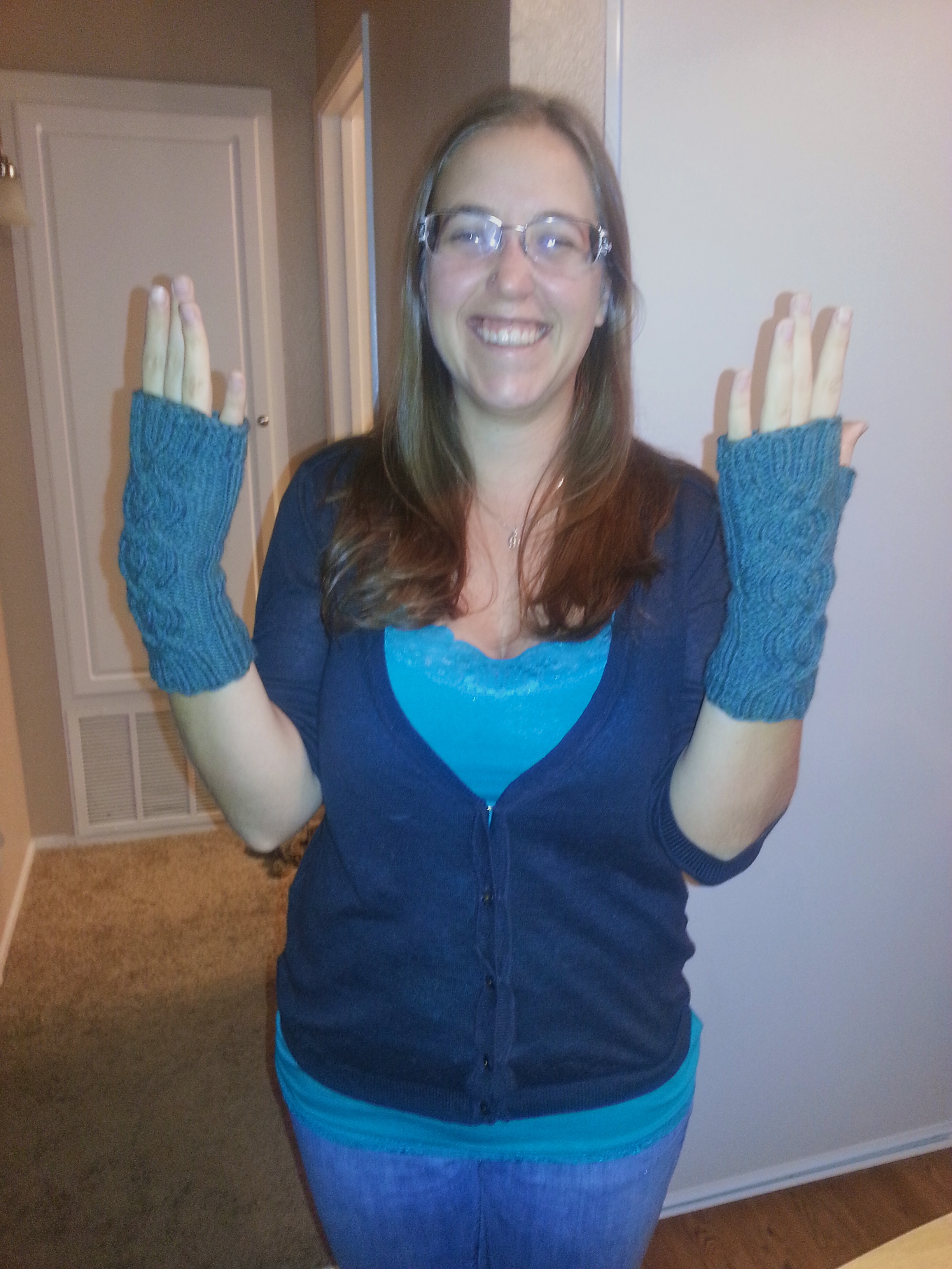 These fingerless mitts were a good fit, and I got to practice some cool cabling techniques. I’m quite pleased with my decision to frog the original pattern.
