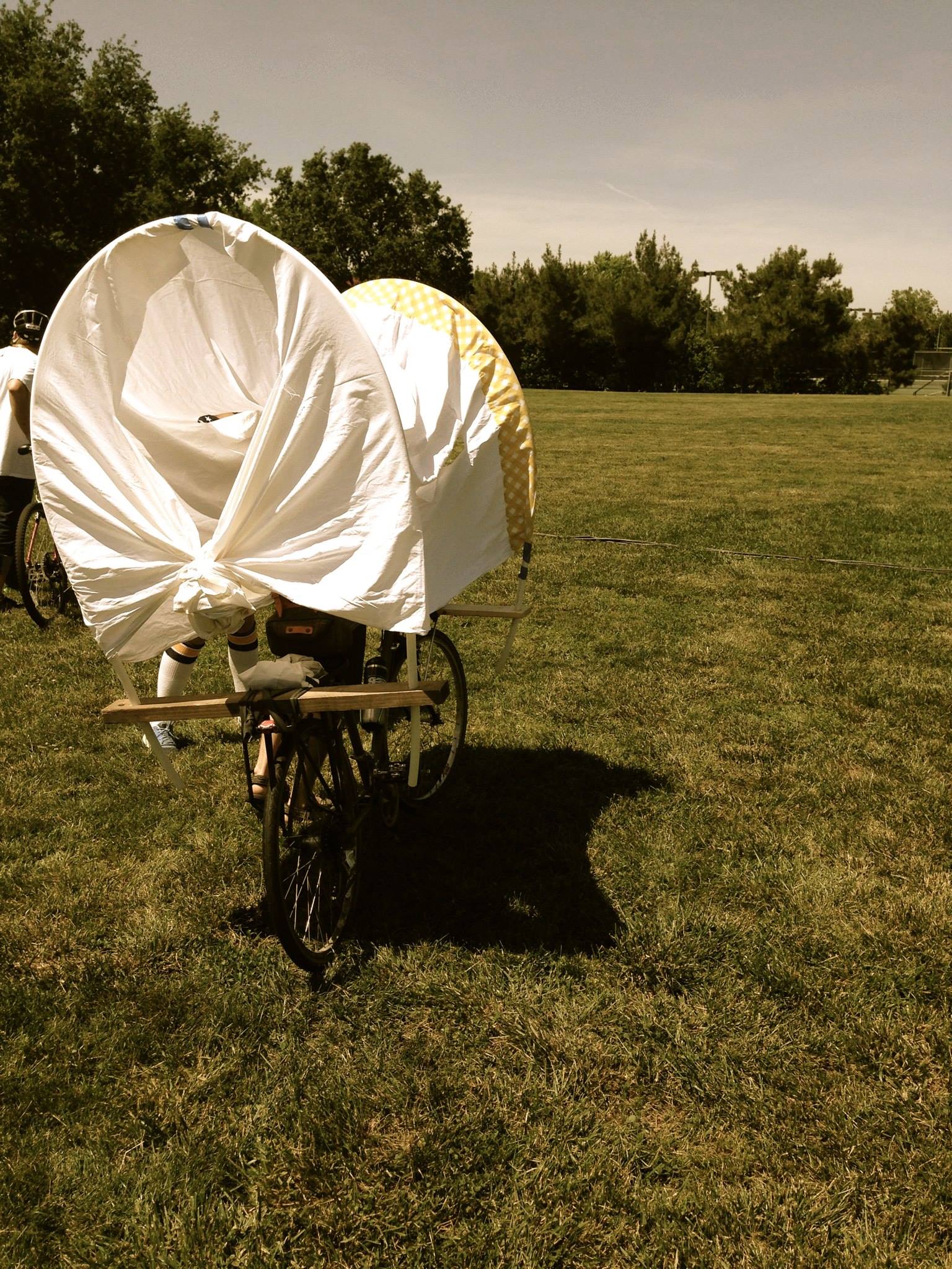 The covered wagon bikes certainly made us stand out. I was not directly involved in their creation, but I can describe some of their basic construction. For bikes that had back baskets/racks and straight handlebars, the wagons were attached directly with clamps. For those that didn’t, two by fours attached to the bike held the wagon frame in place (a special, large drill bit was needed to drill a hole large enough for the wagon frame to fit):