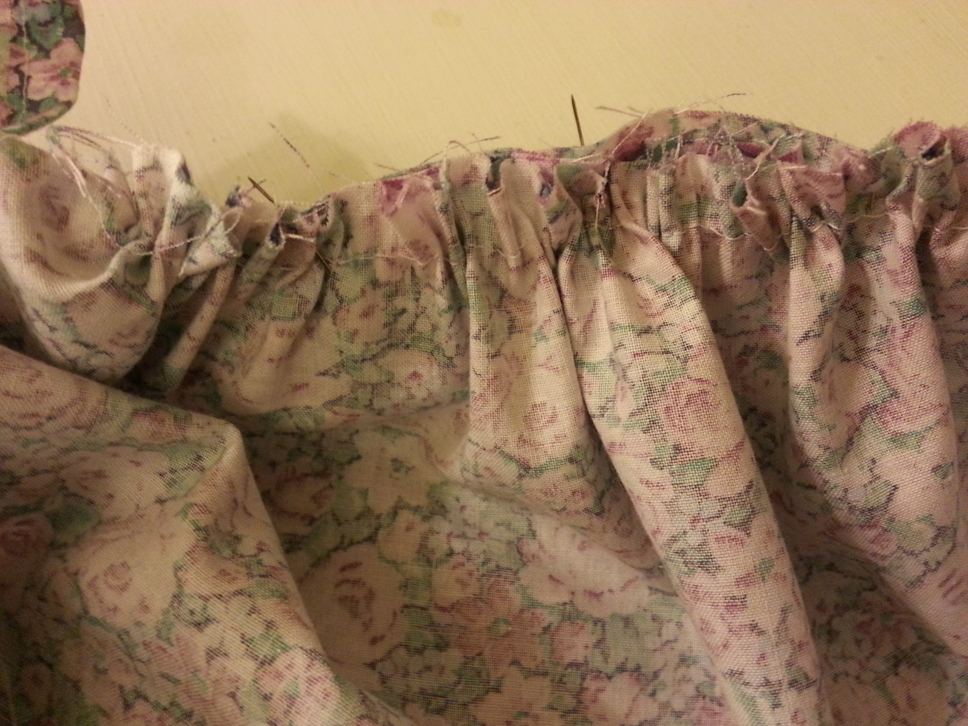 I sewed the bonnet myself, using scrap fabric and this tutorial a friend showed me. It was pretty useful, although it’s helpful to have some minimal sewing knowledge, like using interfacing and such. The tutorial only really lacks descriptions for two parts: how much and what kind of elastic to use (I used 6 to 7 inches of 1/2 inch elastic, guessing from the tutorial photos) and how to match the head part to the bonnet brim. To do that you need to do a basting (loose) stitch around the head piece, pull the ends of that threat to gather it, and then line it up with brim, so it looks like this: