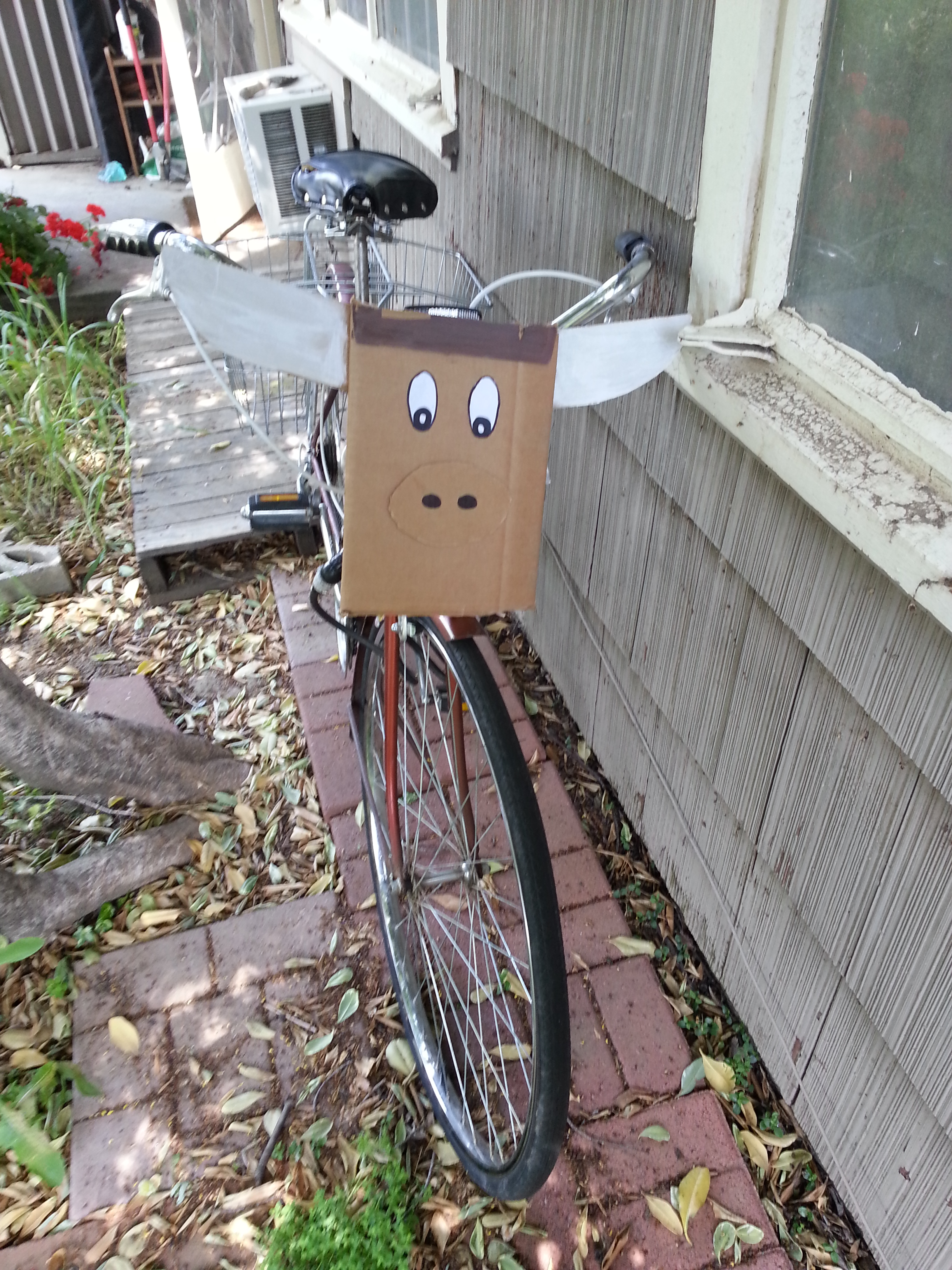 No wagon train would be complete without some beasts of burden! Some of us decorated our bicycles as oxen or horses using paint and cardboard (and one of our team members dressed as an ox as well!). We all made these separately, so there was a lot of variety in appearance. Some of them were realistic, like these oxen, Oxford Comma and Margaret Thatcher: