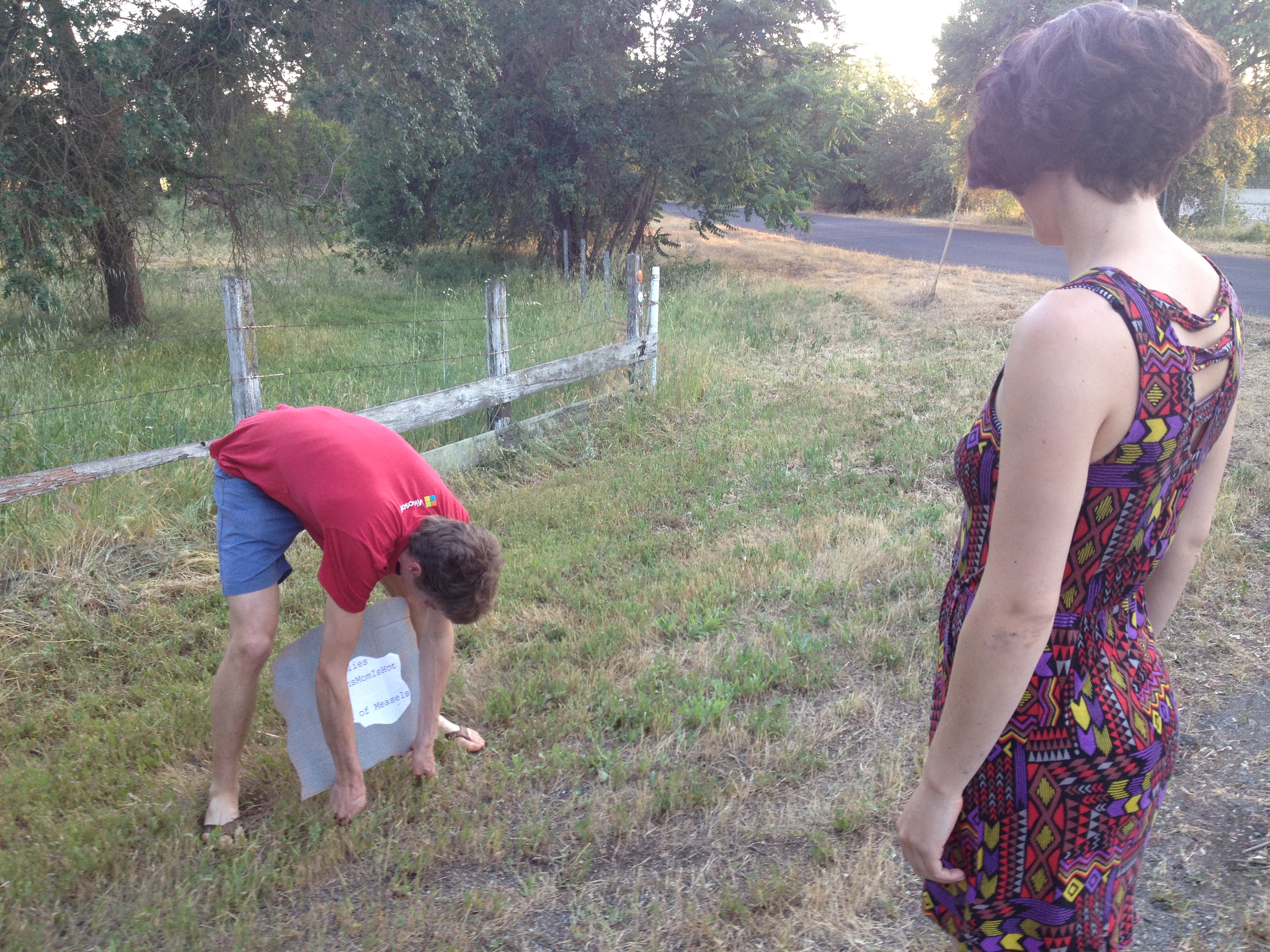 We made the “river” out of two blue tarps, held down by rocks on the sides (we changed the layout a little bit after the photo below to make it a wider river).We left out a sign, a few pieces of cardboard, and instructions for getting across (you can only have as many pieces of cardboard as you have people on the water, and everyone has to be in the river before the first person can reach the other side):