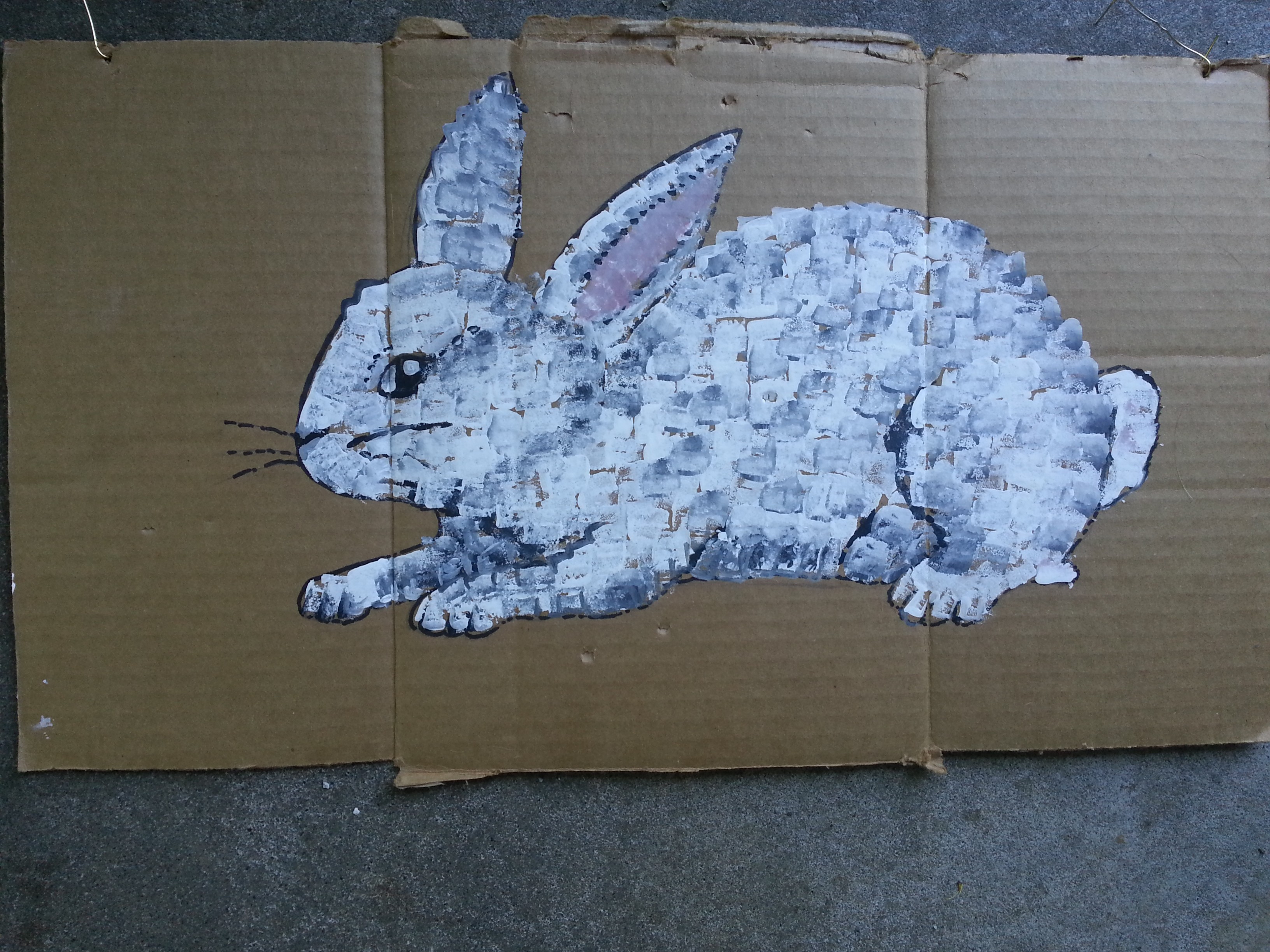 We had a rabbit, a bison, a deer, a squirrel, and a bird. All of them were done on cardboard with either acrylic paints or markers. For the pixelated style, they were filled in with squares of color instead of smooth lines.