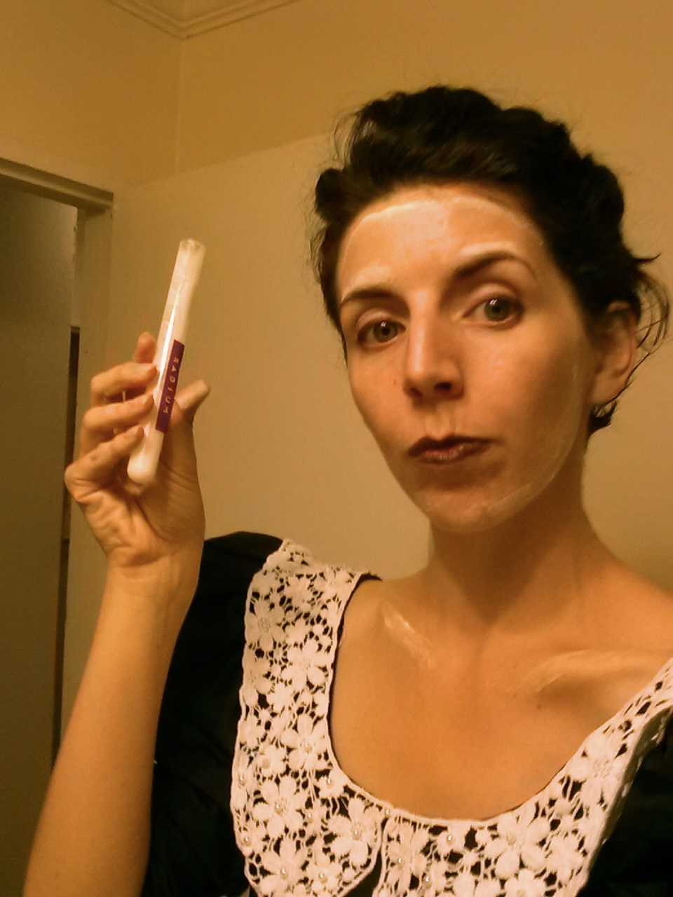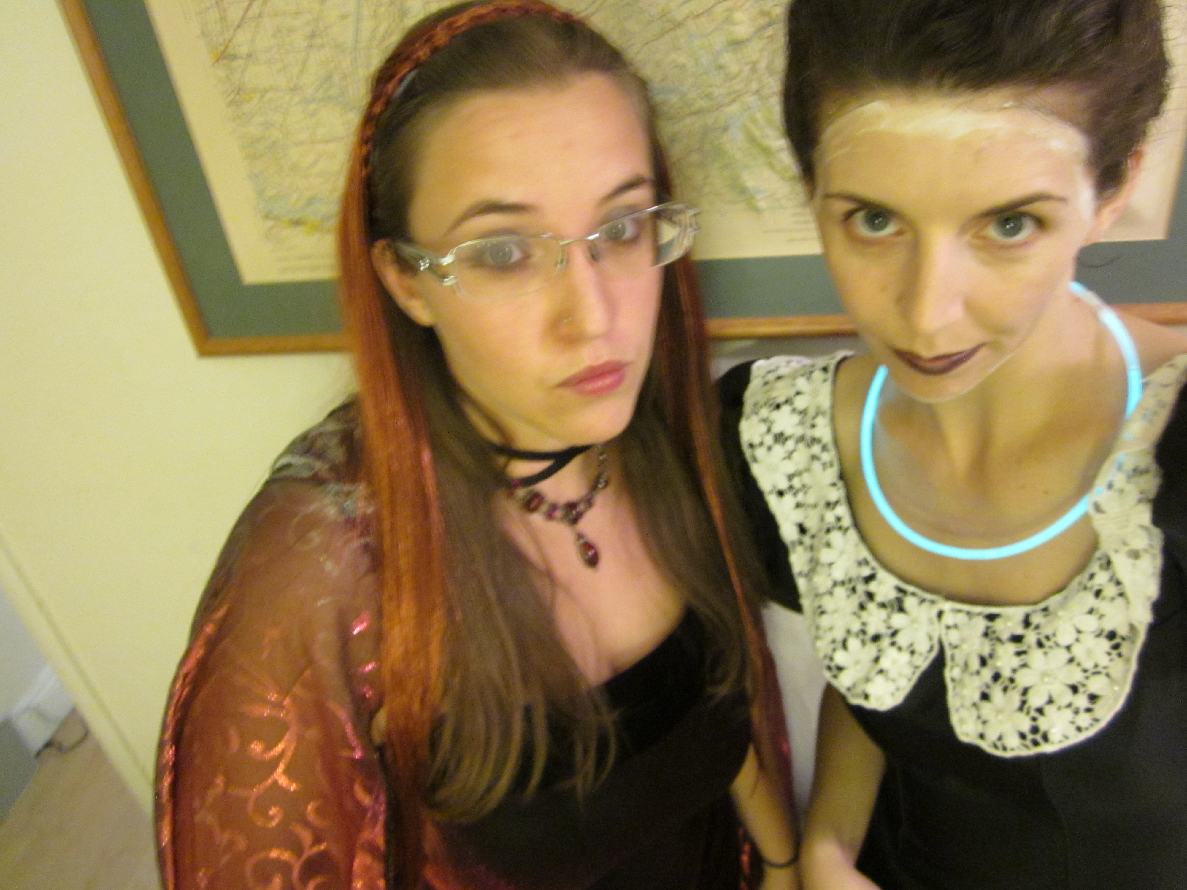 Since I wore this costume to two different parties, so I had some time to work on the ghost makeup. The first time I did it very subtle, as in the close up above—white powder on my face, light gray eyeshadow around my eyes, and black lipstick. But the next time, I went for a more ghoulish, undead look.
