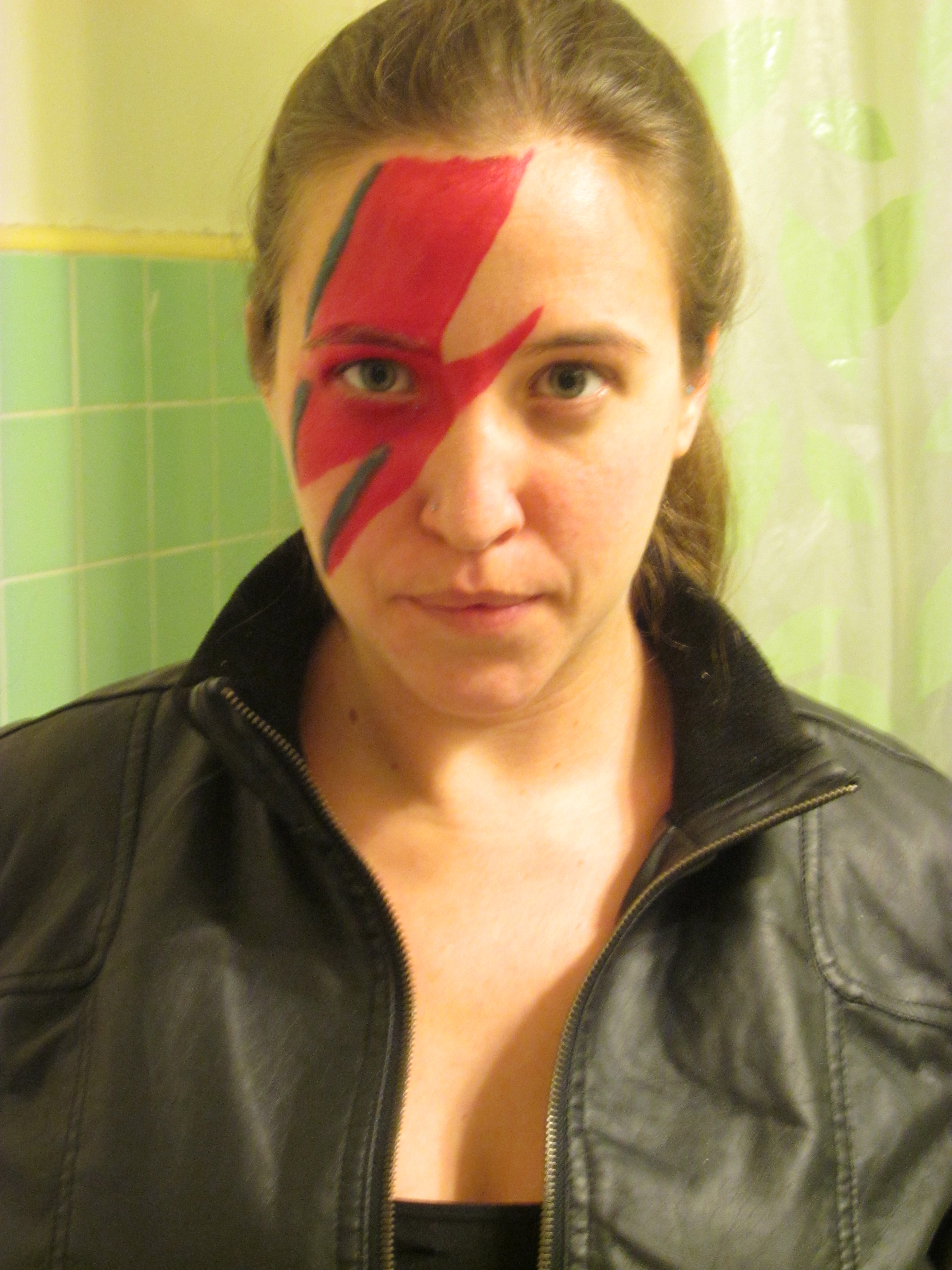 This is David Bowie circa 1973, where we recreated the lightning bolt makeup from the Aladdin Sane album cover. You can buy Halloween makeup, but I used bright pink lipstick, dark teal eyeshadow, and black eyeliner. It stayed put really well, but be forewarned that your face may have some residual pink the next day! Not included but recommended: leather jacket and a bad ass expression.