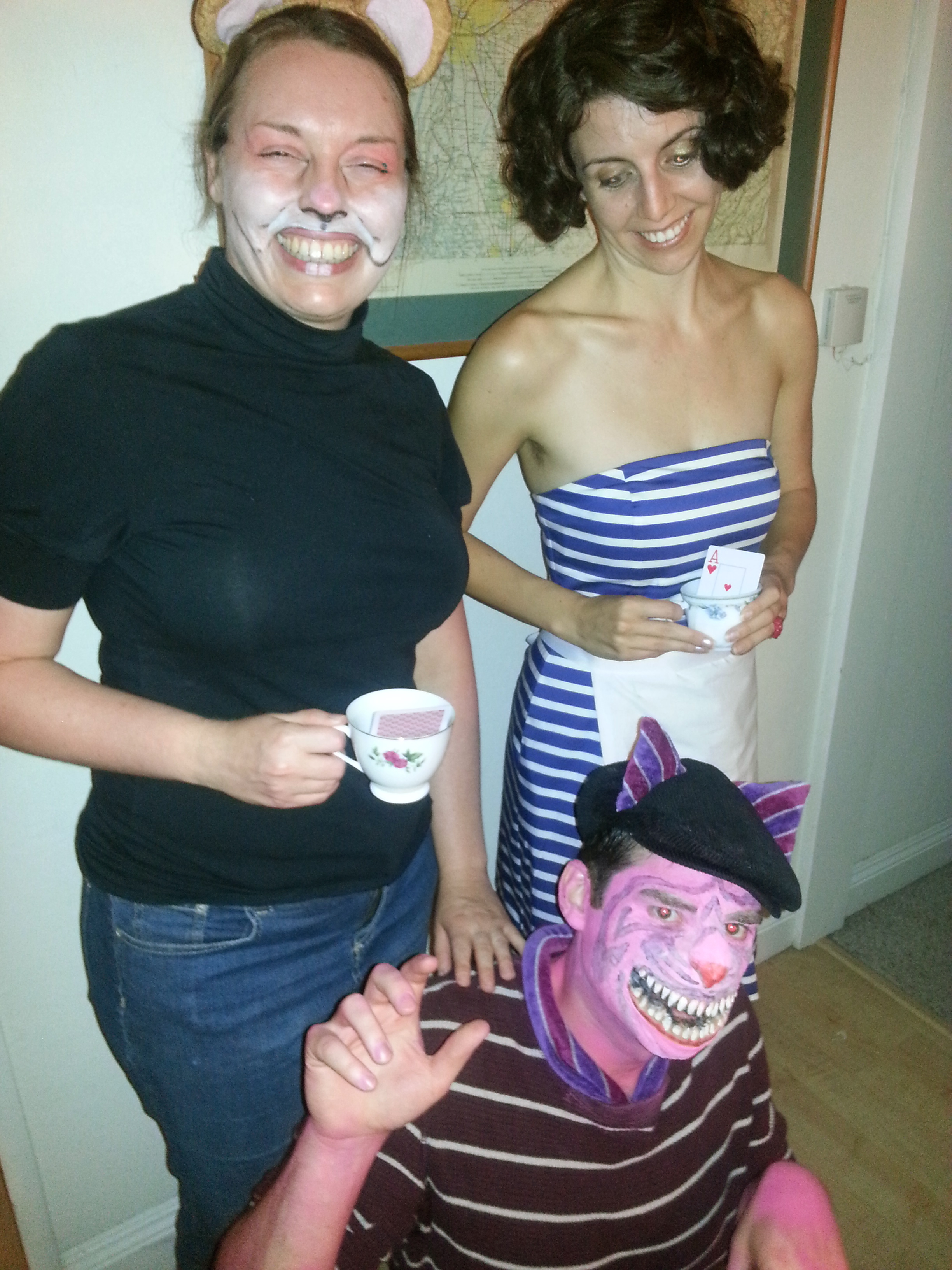Seen here with the Queen of Hearts, you can tell that this is a much more advanced costume project. But doable if you are adventurous! There’s actually two prosthetics, a cat nose and a grin, that he attached. He used spirit gum to attach the latex prosthetic to his face and liquid latex to blend the seam—you can get an idea for how to actually do this from this prosthetic nose tutorial. The effect, as you can see, is pretty remarkable.