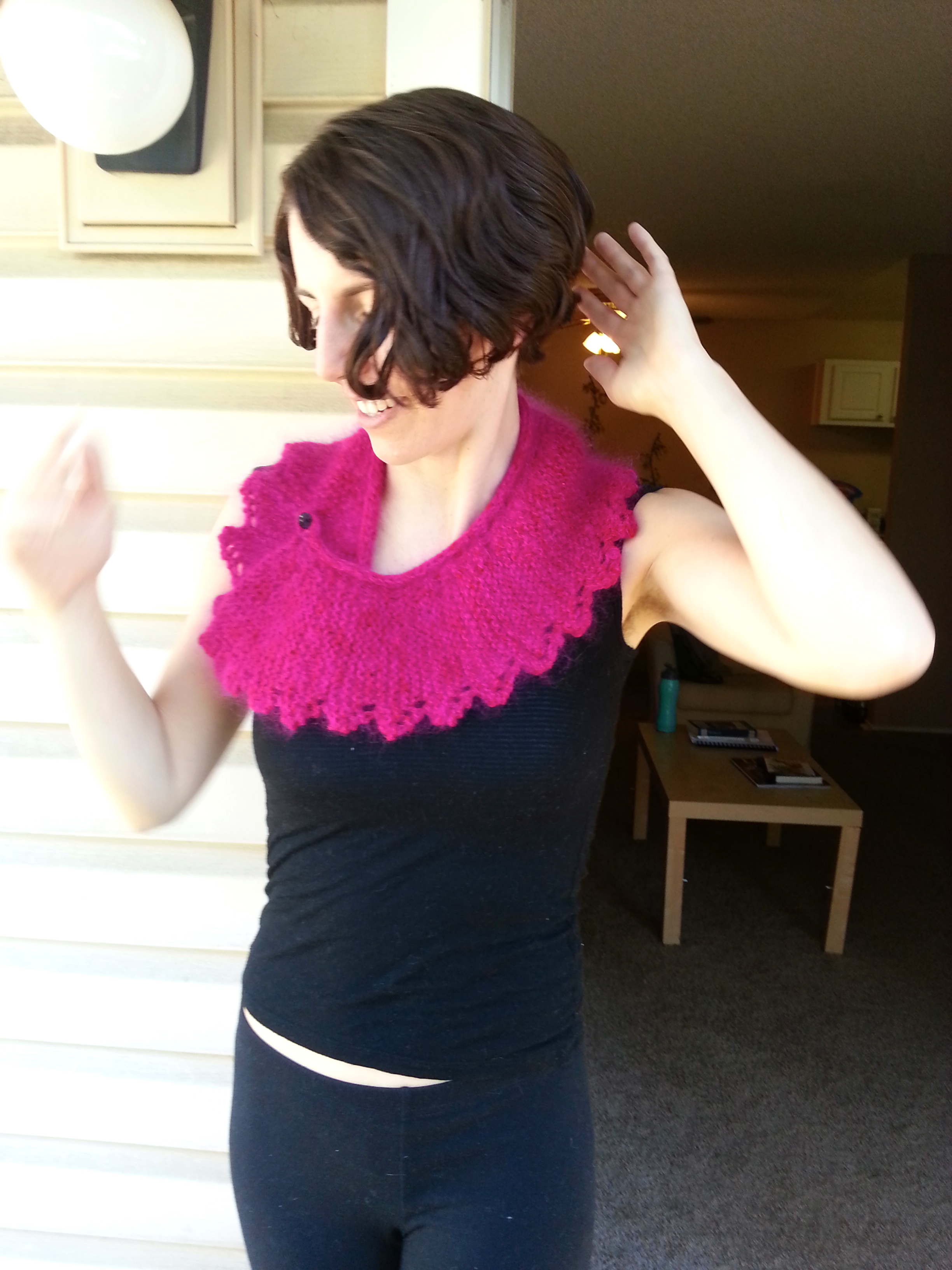 This in-progress shot gives you a view of what the strands of yarn look like by themselves! It’s a pretty straightforward pattern that works with a variety of yarns and is not too difficult to memorize. You can also wear it in a number of ways, depending on how you attach your pin or button. I’m thinking about attaching another button so I can wear it differently. If you’re not ready to commit to a hot pink top, this is a good way to use a brightly colored yarn. I mainly wear this with neutral colors, especially black.