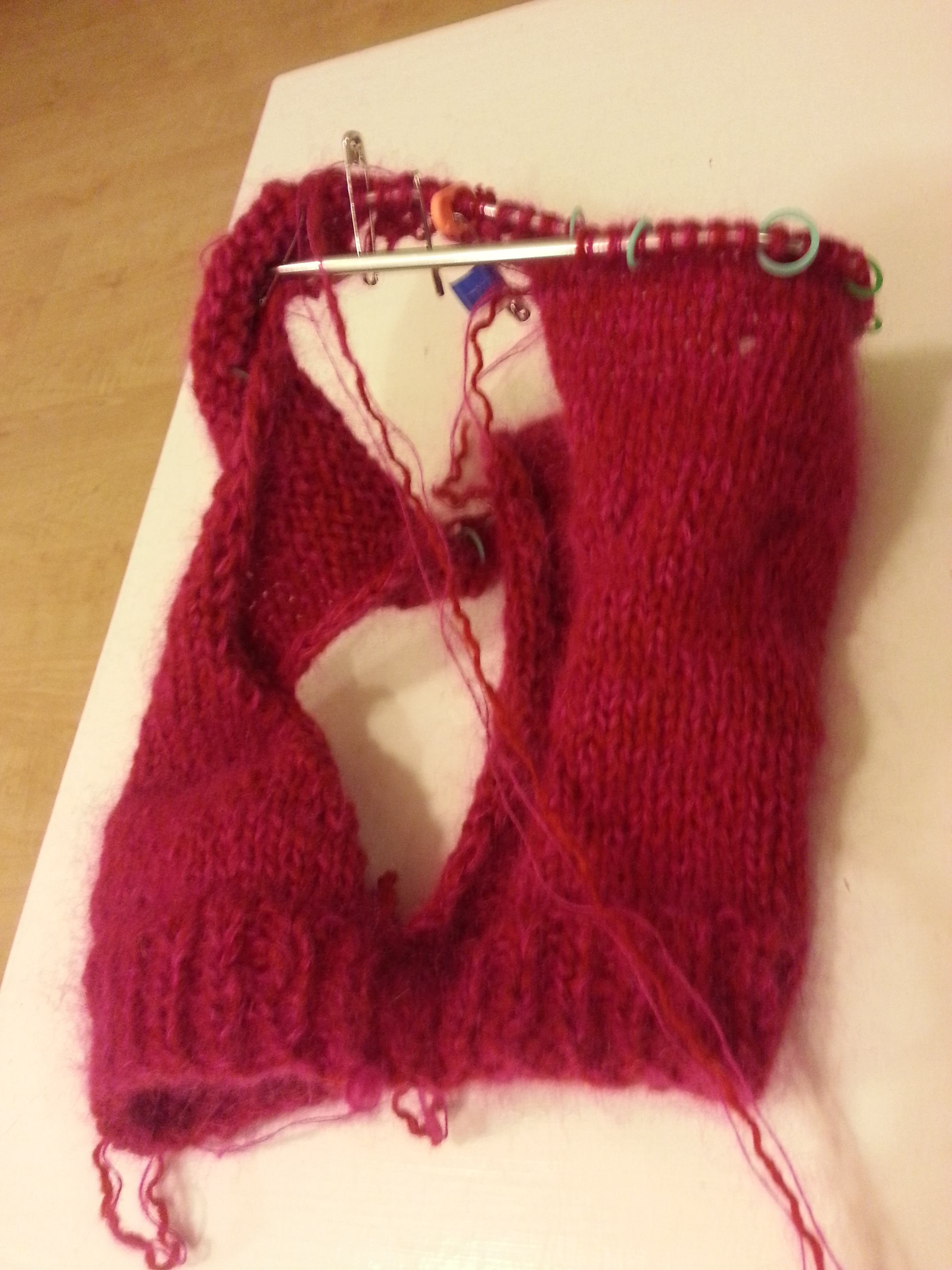 This photos is probably the closest to the true color of this tank. To get this color, I held together one strand of sport weight red wool I recycled from a thrifted sweater with two strands of a hot pink, lace weight mohair yarn that I have literally had in my stash since my roommate in college gave it to me. I have no idea why I kept it, but I’m glad I did.