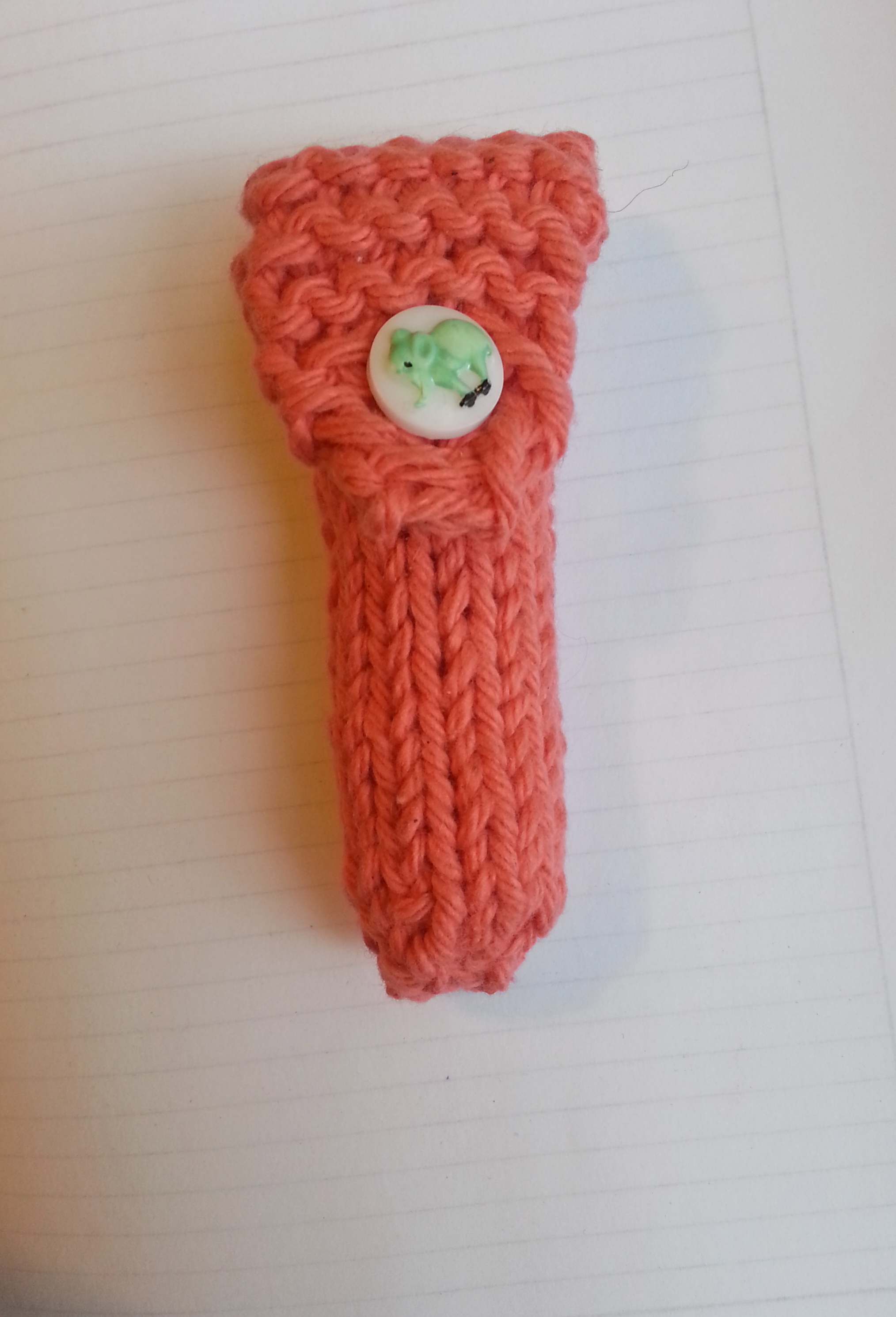 This is the only quick knit that wasn’t for me. After showing my sonic screwdriver chapstick holder to friends, I got a request for a basic chaptstick holder that could attach to a harness during rock climbing. So I used Victoria Trauger’s Chapstick Holder pattern and made this. I could tell you about how in my version I made some mods to make it fit better (12 stitches around instead of 16, 6 stitches instead of 8 for the flap), or how I love the elephant button I used at the top. But mostly I want to tell you why this is related to Valentine’s Day knitting. I supposed it could be the connection between chapstick, lips, and kissing. But personally, all I could think when I was making this pattern in this color was, geez, this looks really…phallic.