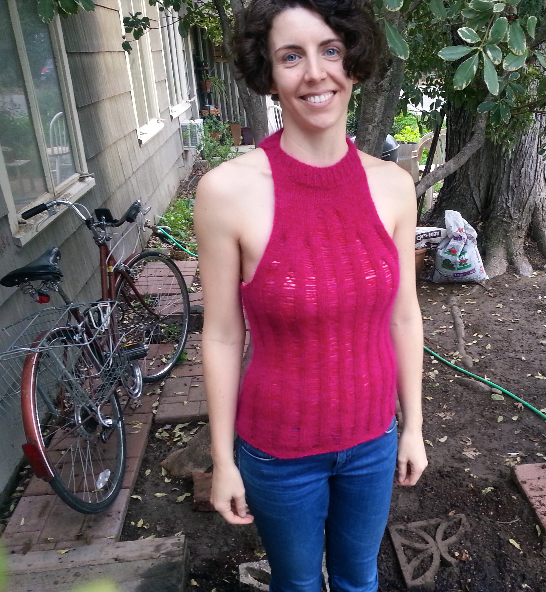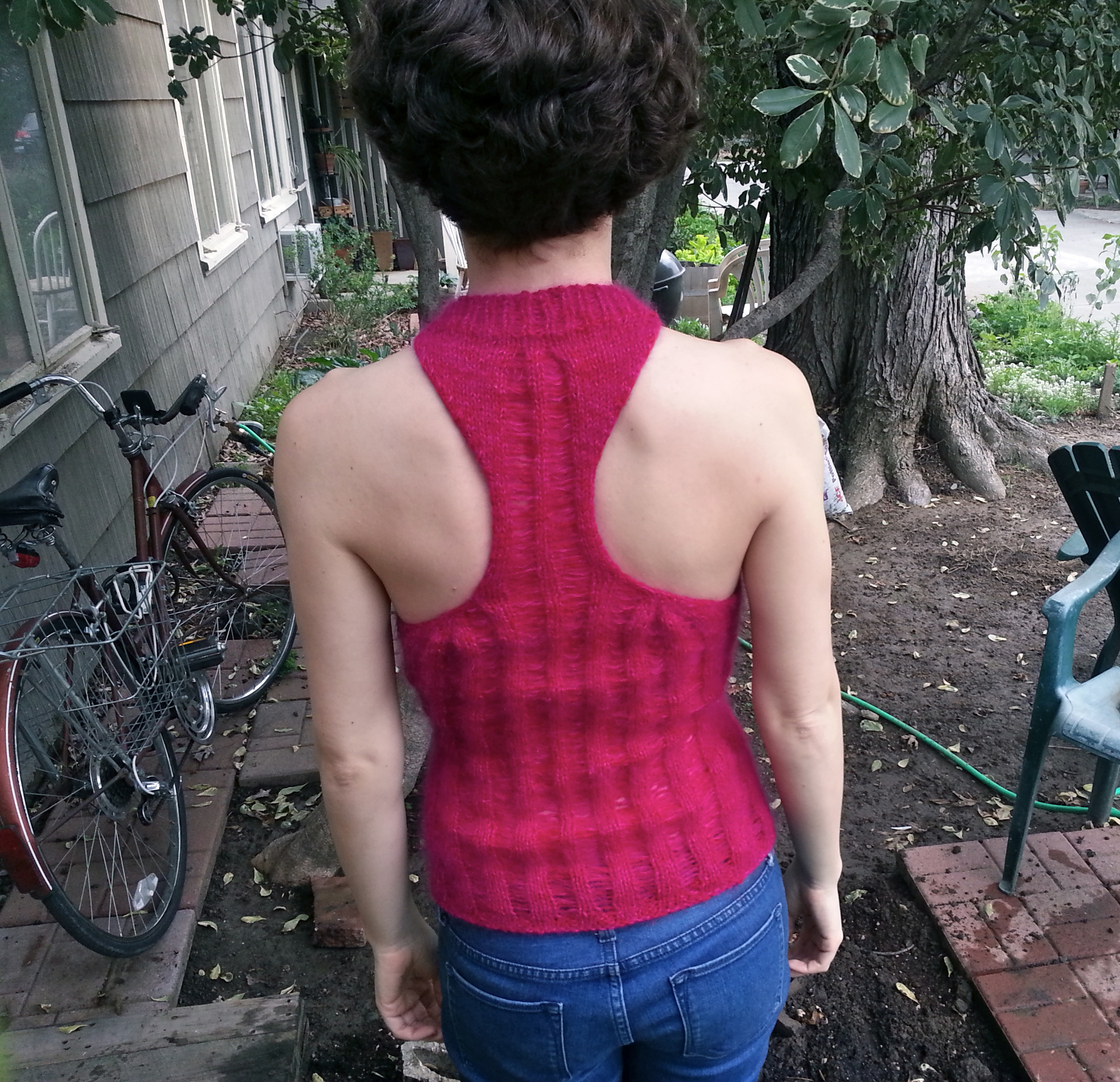 There aren’t a lot of photos of people wearing this tank on ravelry, and I can tell you why—when you knit it in one skein of cotton yarn as directed, the drop stitches make it really revealing. In my version, using three strands of fuzzy yarn, this is not as much the case unless you are looking rather closely.