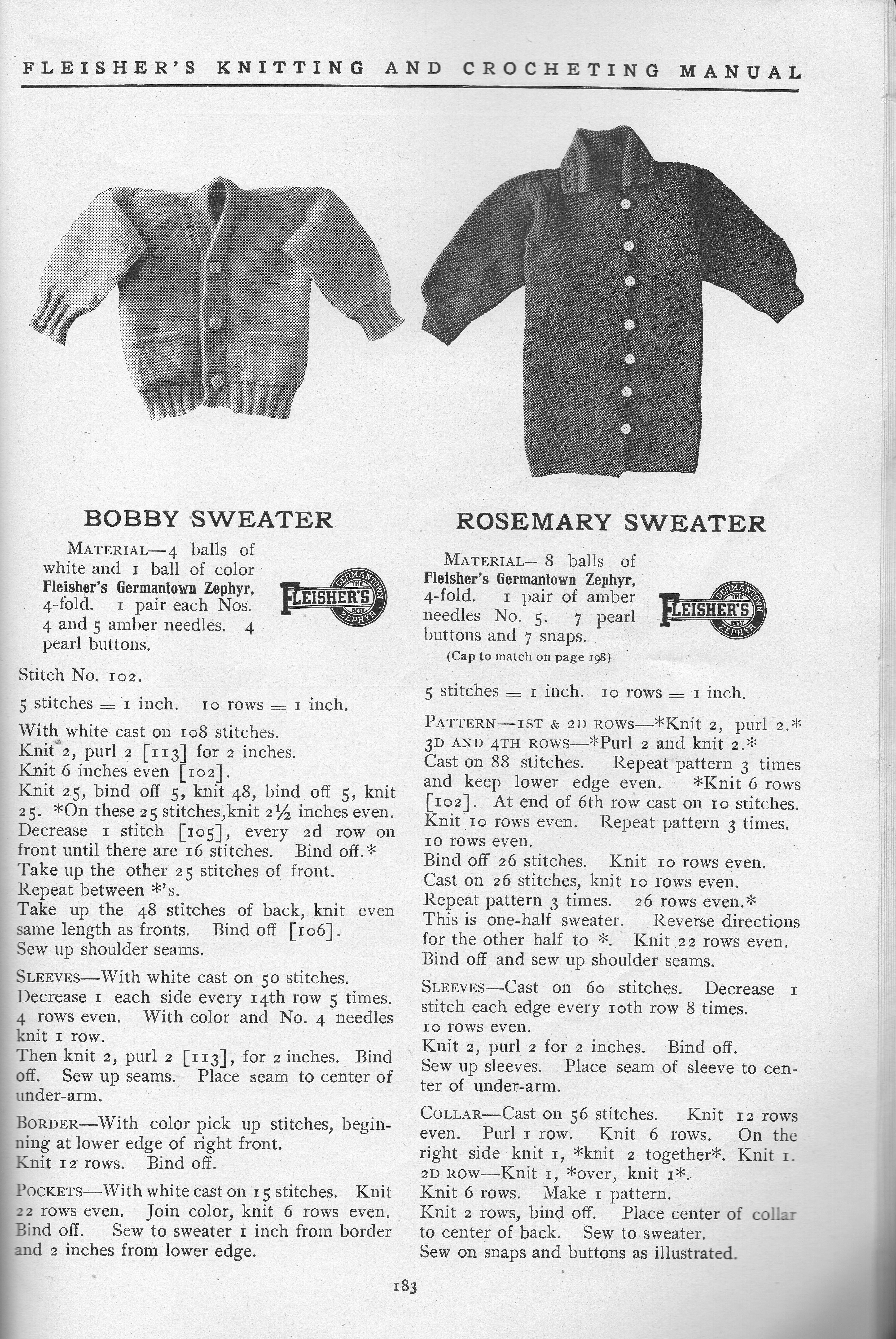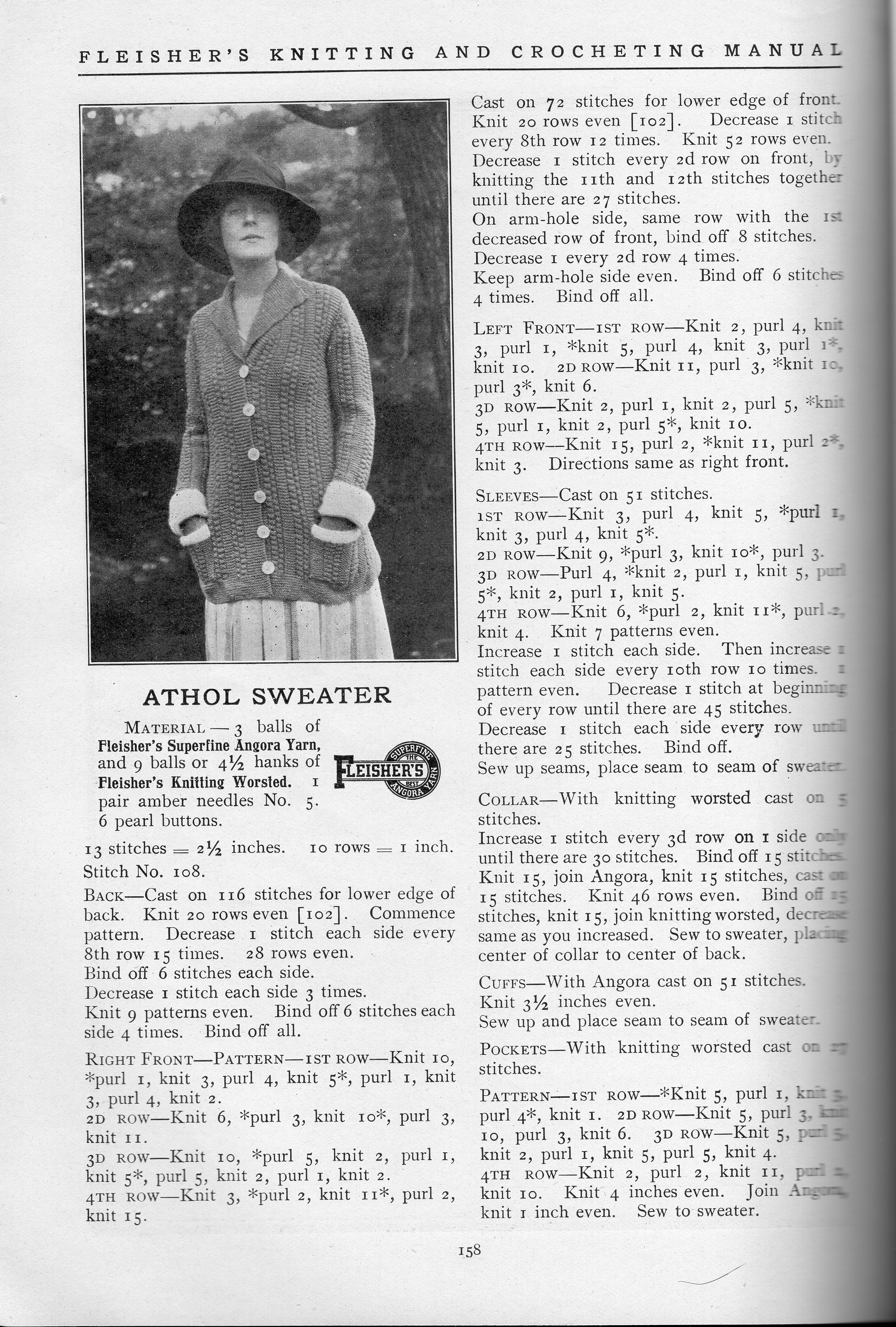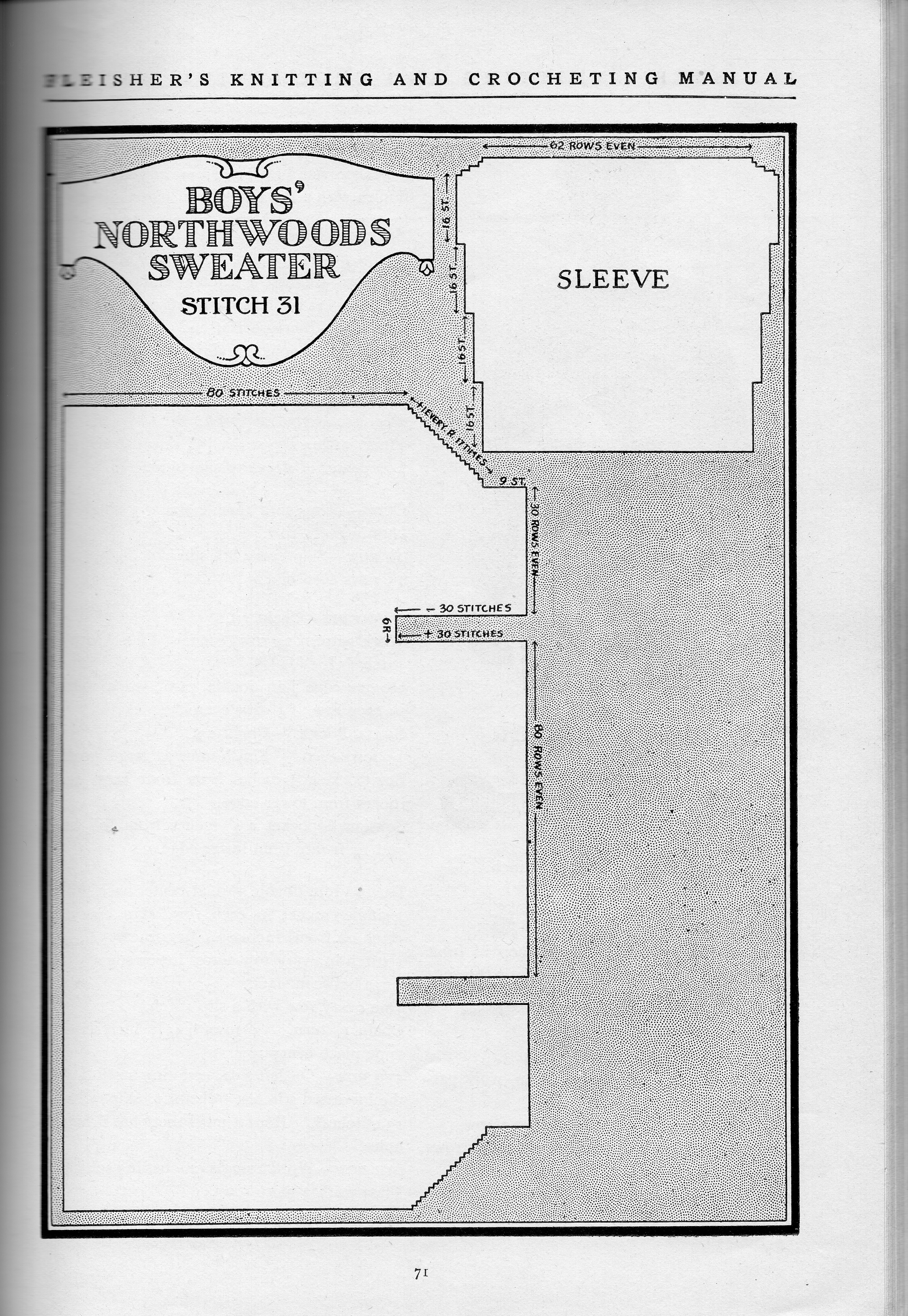 One of the interesting things about this Fleisher’s Manual is how many crochet patterns it had. Northwoods is a boy’s cardigan done in crochet with a worsted weight wool yarn. I think every detail of this sweater is nicely done—the pockets, the cuffs, the shawl collar.
