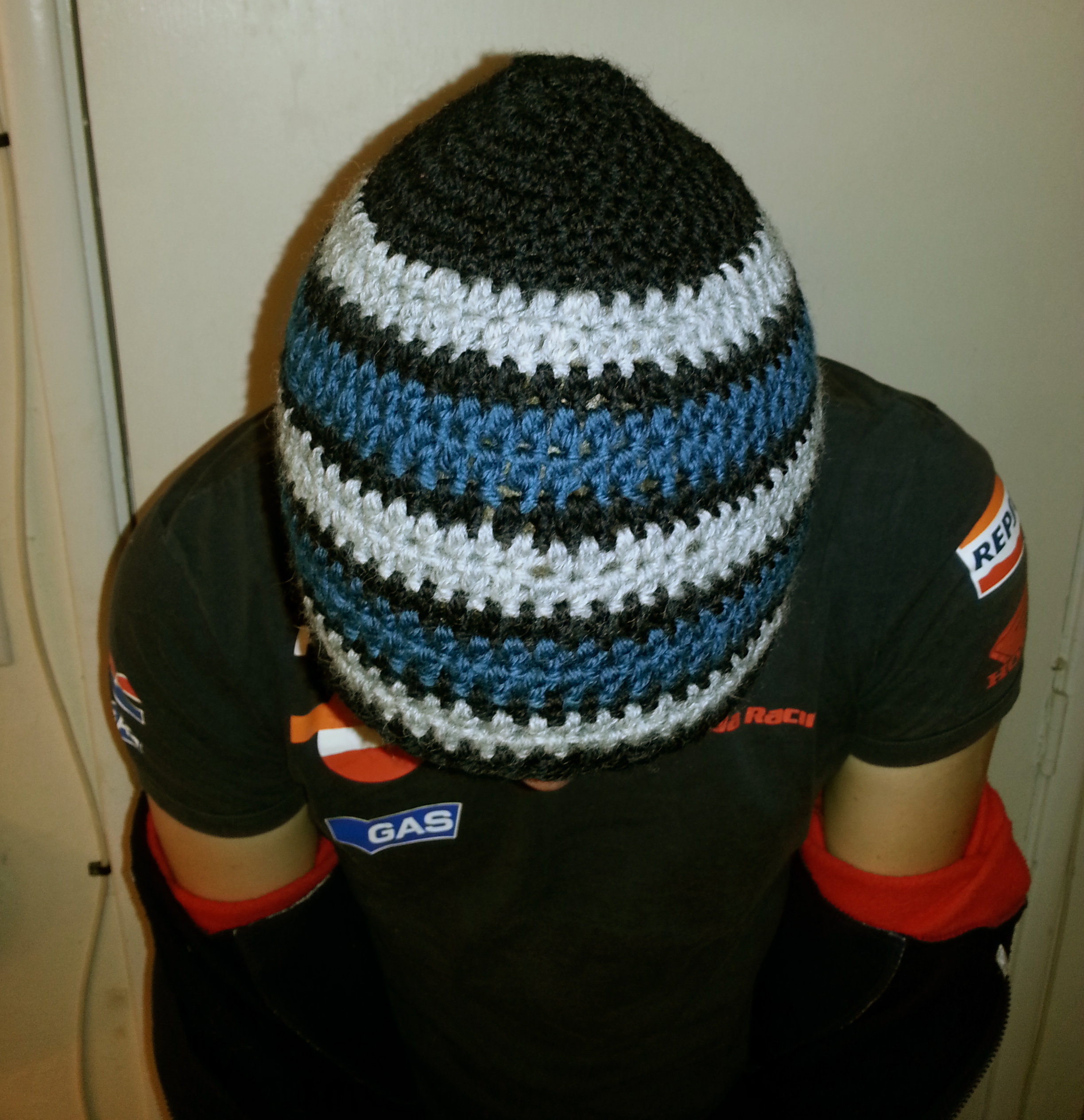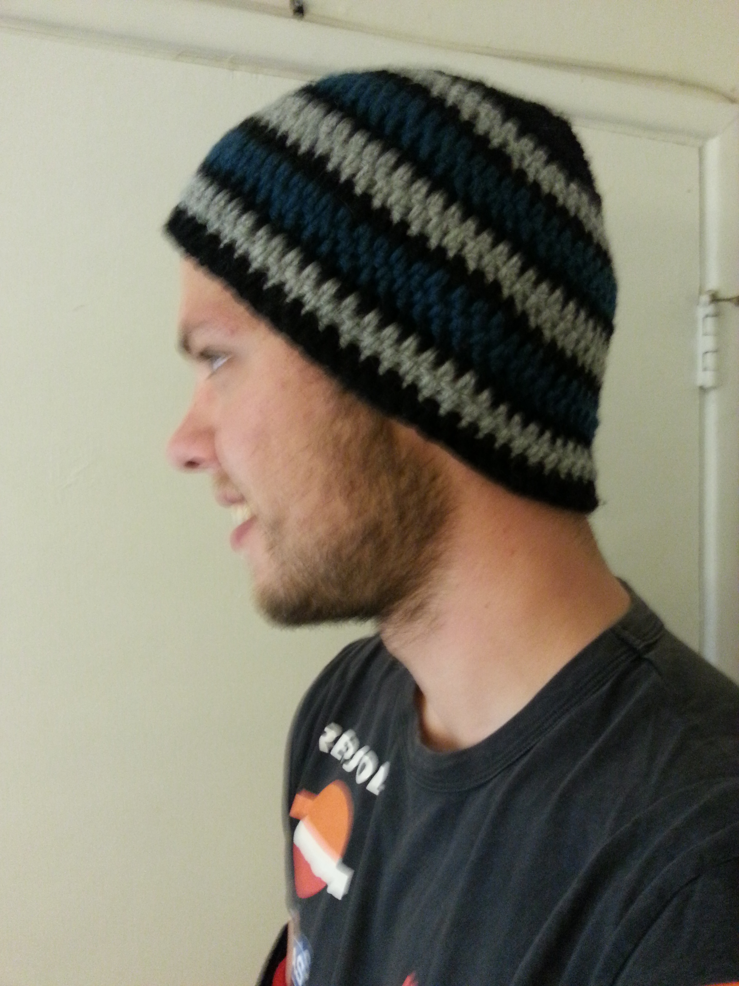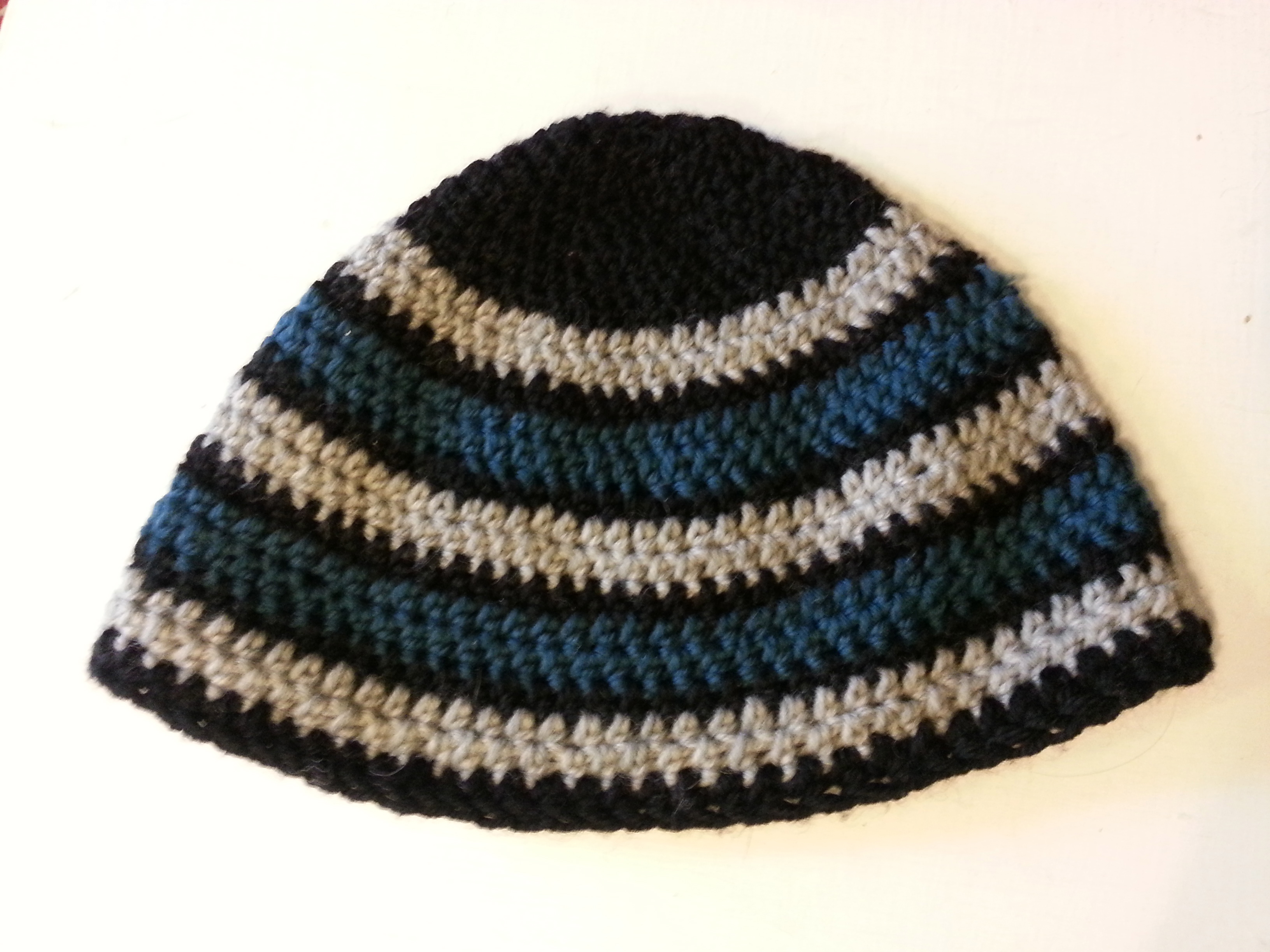 I made this beanie in a few hours using blue, gray, and black worsted weight wool from my stash. I placed stripes of blue and gray two rounds tall between stripes of black that were one round tall so no one color dominated.
