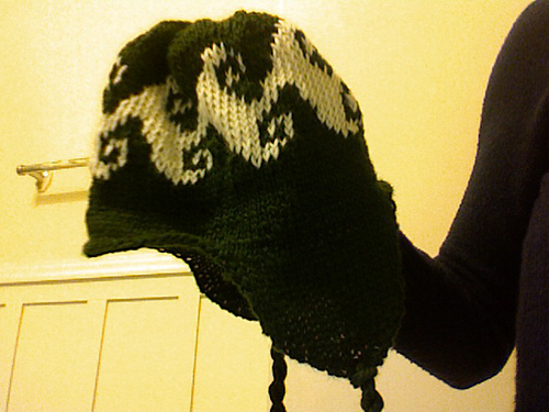 In my version, I omitted the peace sign on the earflap and joined the flaps to the hat with knit stitches in stead of purls to make it more seamless.