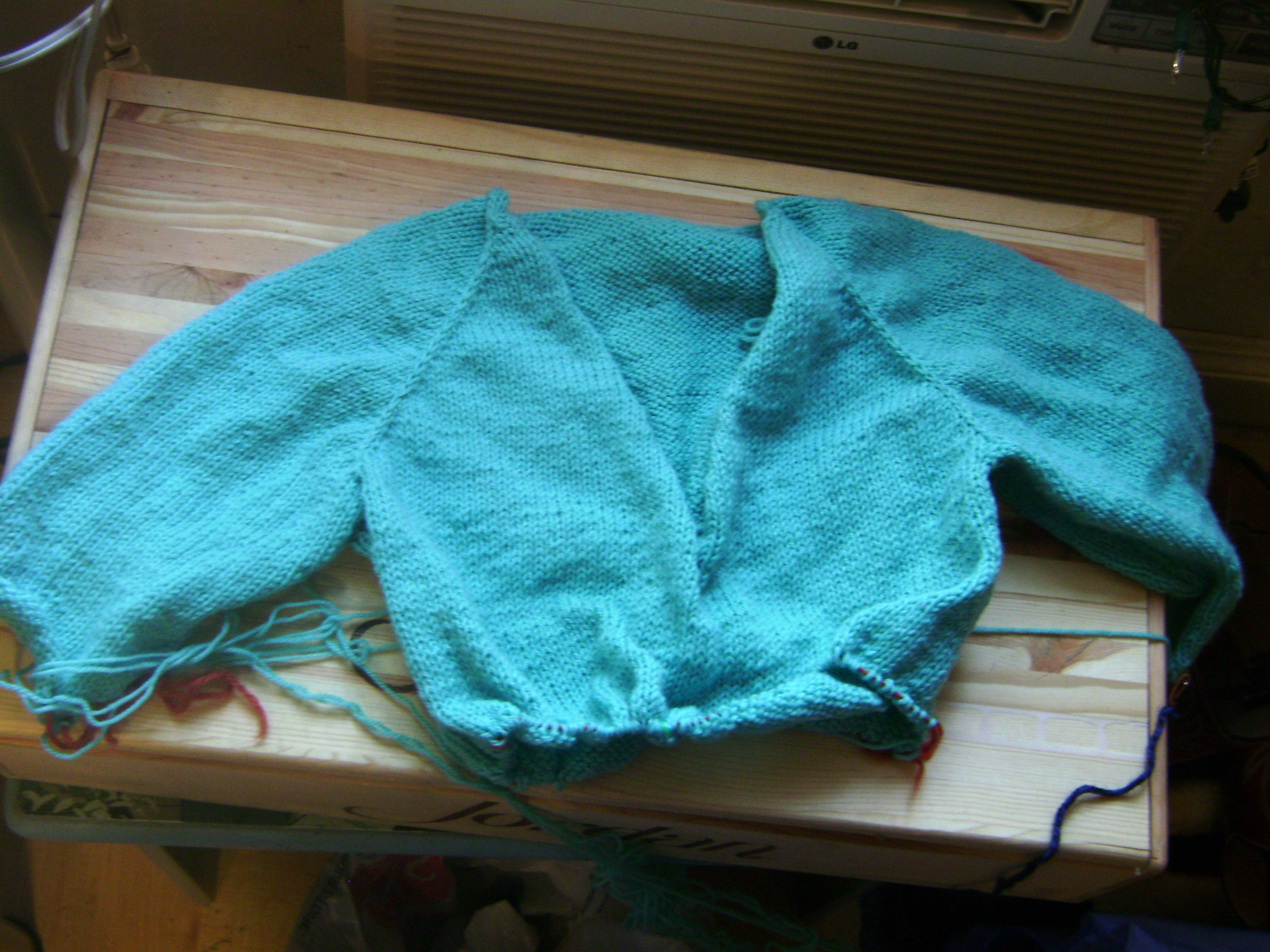 Unlike the cowl, with this project I started with Pamela Costello’s customizable pattern and then went through my stash to find enough yarn to knit it! I know it’s technically “aquamarine” not blue, but close enough:IMG_1065As I noted before, the main difficulty I had with this sweater was learning how to do the raglan sleeve increases while knitting left handed. I had no trouble at all with the directions to make it a V-neck (I did an increase every 4 stitch for this depth), and I loved being able to try it on in stages as I made it:I will say that the estimated yarn was not accurate for me because at almost 5’8 but making a rather small size otherwise, I ended up with extra skein of yarn (Hayfield Grampian DK wool blend, if you are curious). I loved that I was able to make it long enough for my arms! I might have made the V-neck  even deeper if I’d known how much the ribbing would add back to it— here’s the non-blocked sweater before adding the neck ribbing, and the blocked sweater with neck ribbing: