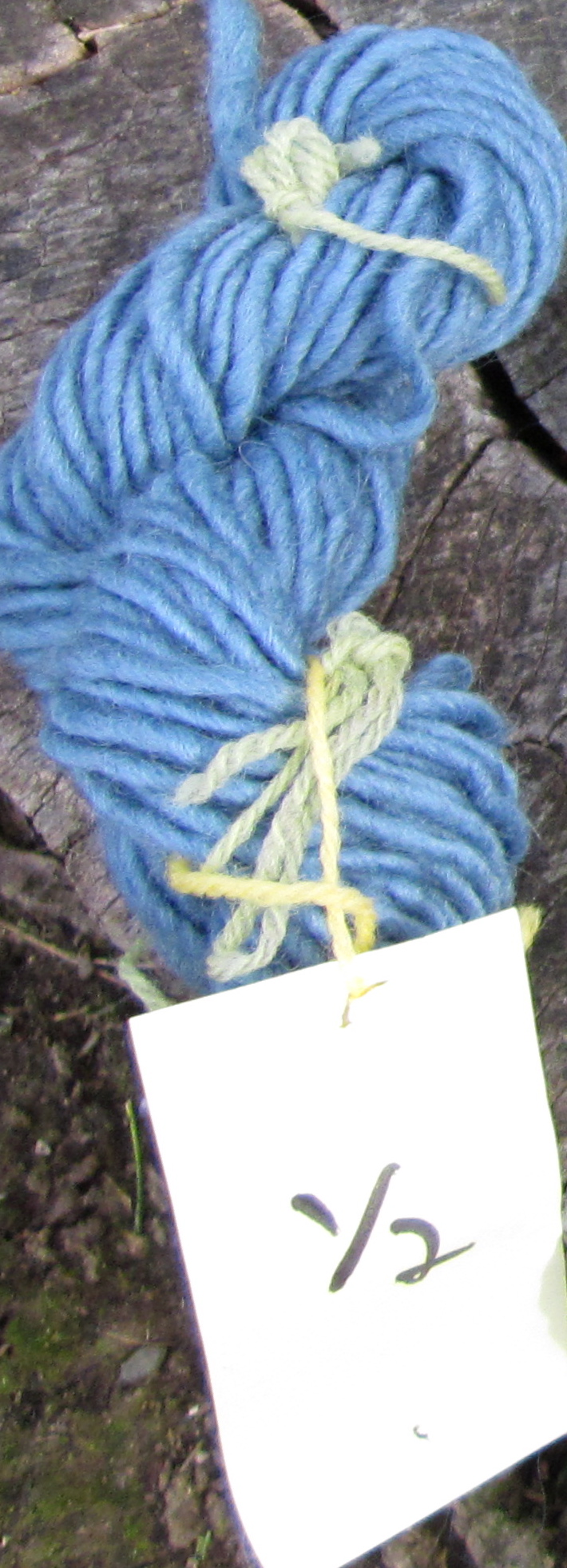 As you may recall, the blue yarn was separated into 1/2 oz. dye lots and one 1 1/2 oz .dye lot. As I mentioned at the end of this post, I went back and divided the larger blue yarn into three 1/2 oz. skeins and overdyed so that every 1/2 oz. was a different shade of blue. Way too much work!
