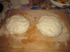 Here’s where you divide the dough, let it rest, then put it in loaf pans. My bread pans are two slightly different sizes, which is why they look a little weird.