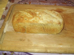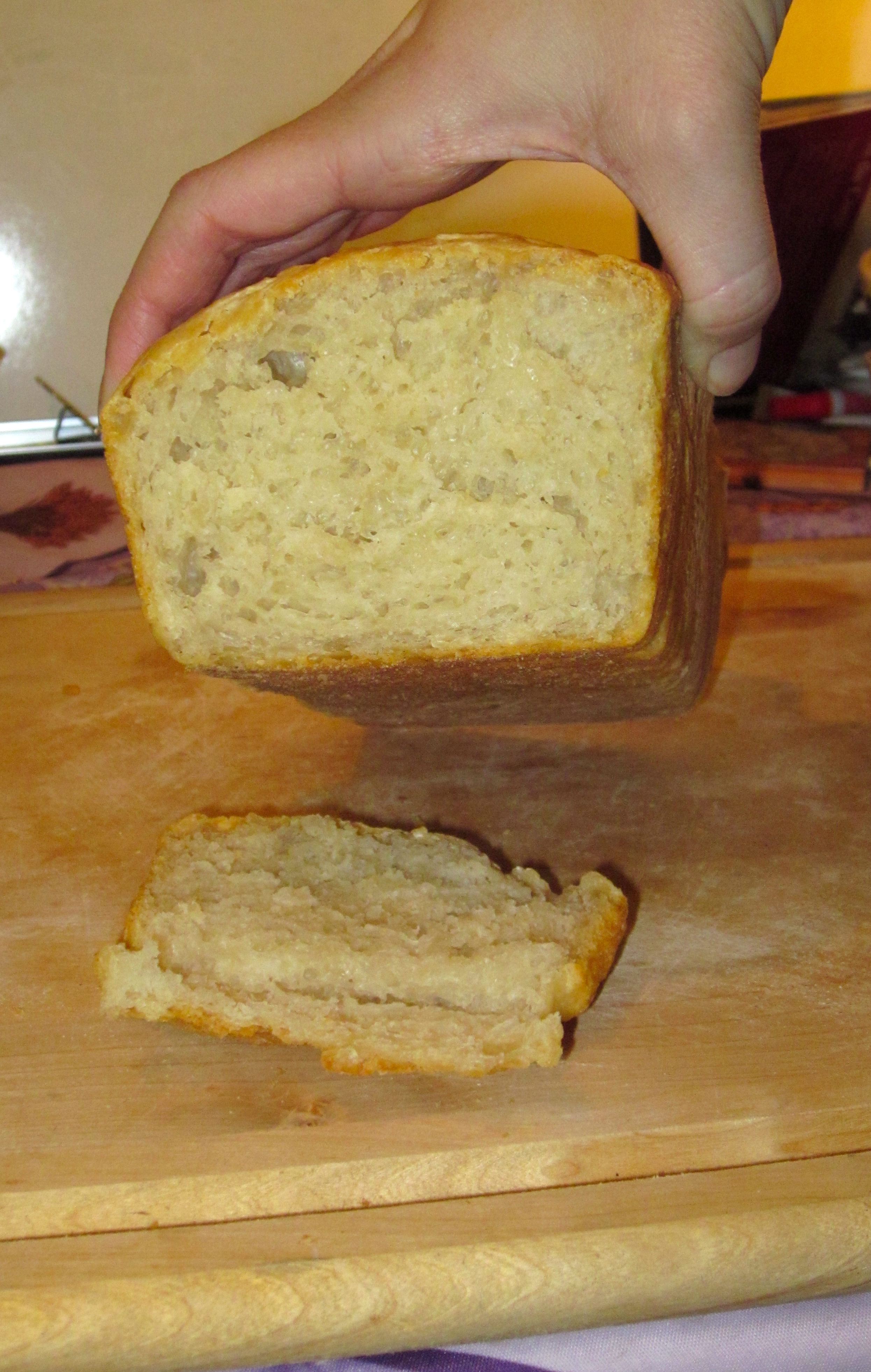 Finally, the baking part! While the recipe said 40 minutes at 375 degrees F, mine took closer to an hour. I blame the small bread pan and the fact that my oven runs hot, but since I don’t know how hot, I have to cook everything at much lower temps than suggested.  But with some watchful baking, I managed to get it to a lovely golden color outside, with lots of awesome little air pockets inside!