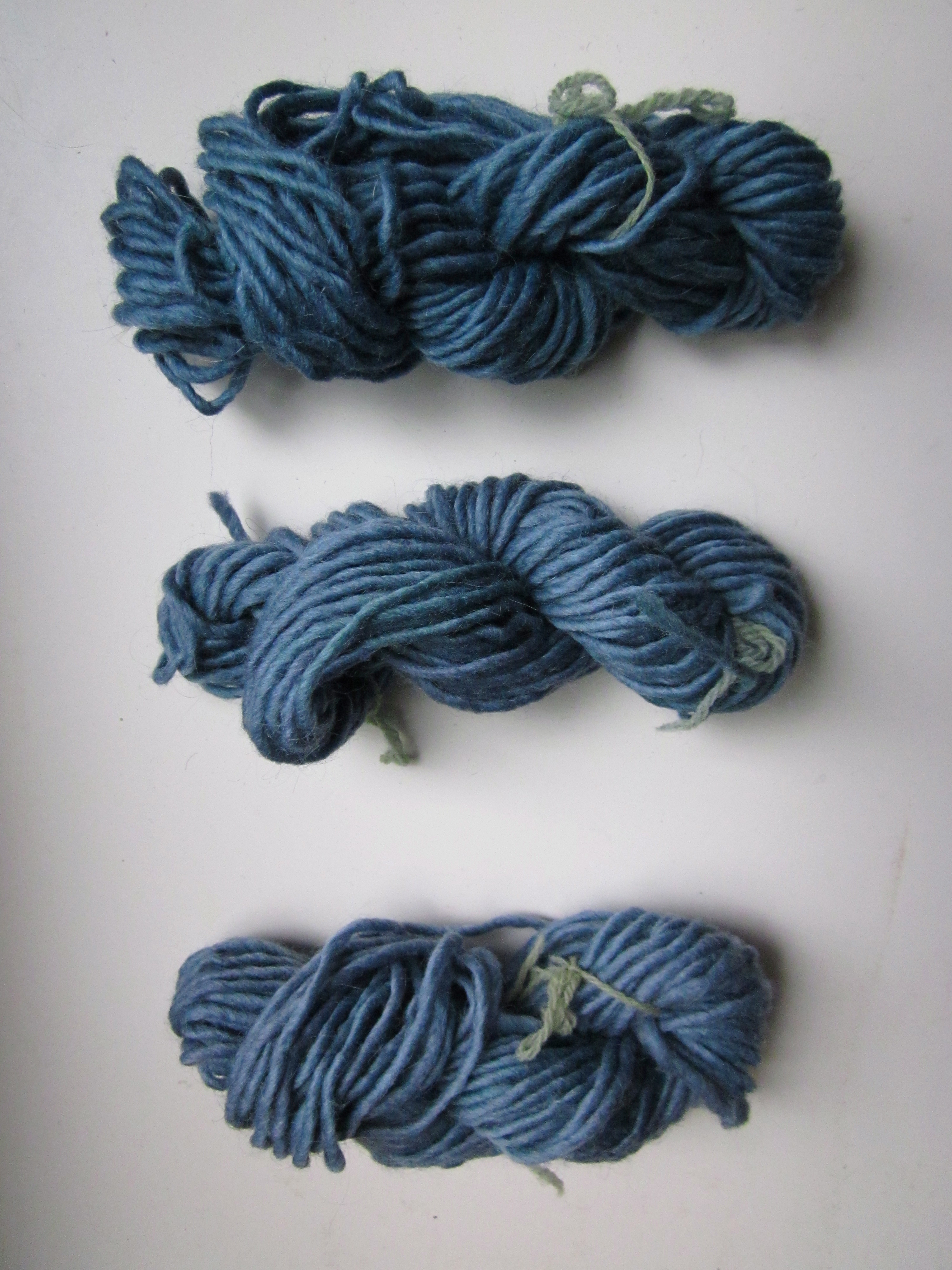 The photo in the blue plastic jar came from round two of dyeing the yarn. After I took out the four small test skeins, I still wanted to dye the remainder of the yarn. So I soaked and mordanted the remaining 2 ounces of yarn, poured all four dye lots into the blue plastic jar, and let it stay there for 48 hours. Not very scientific, although hopefully you can see in the photos that it came out a slightly grayer and more muted shade of blue—one which I still quite enjoy.