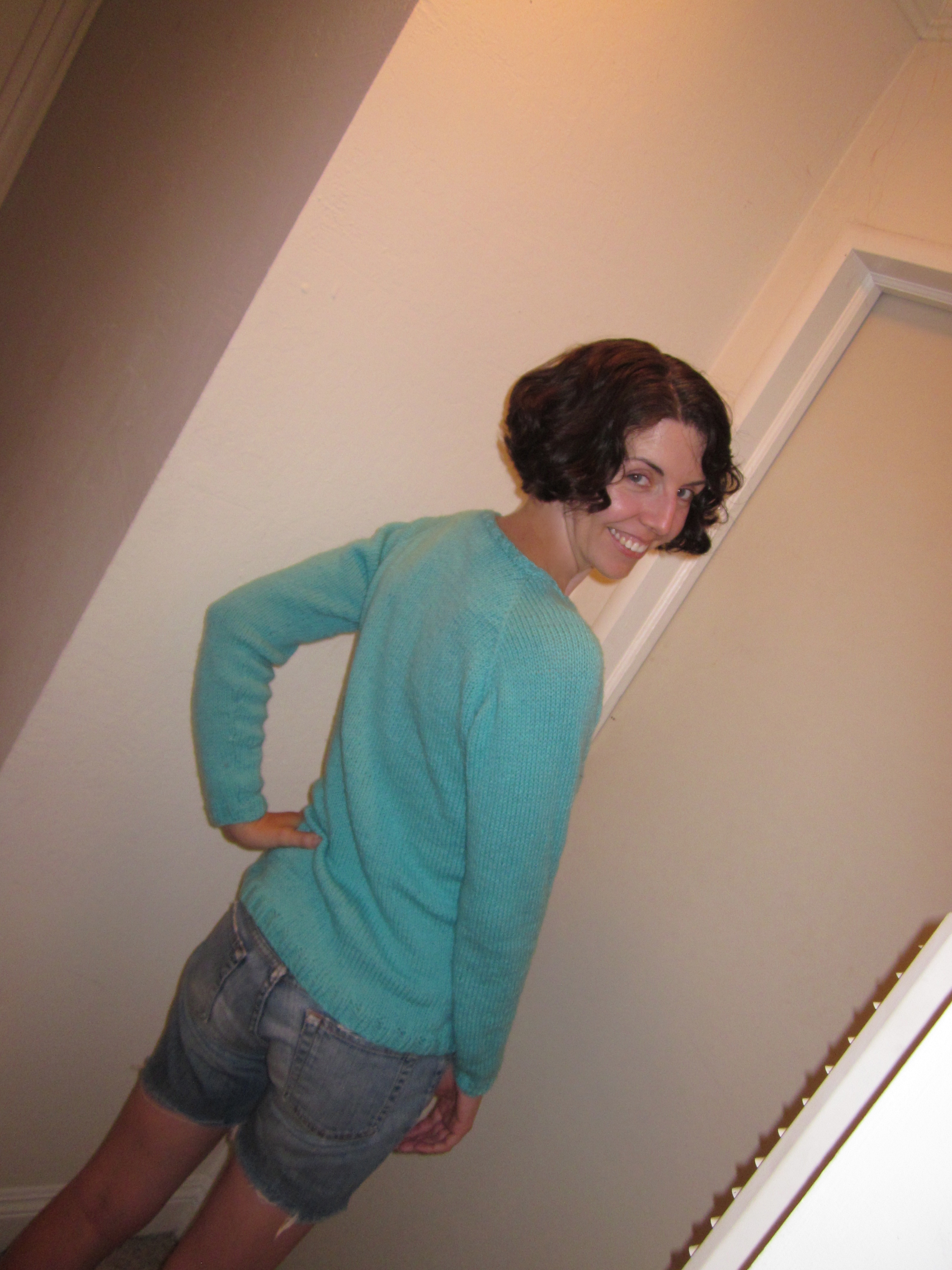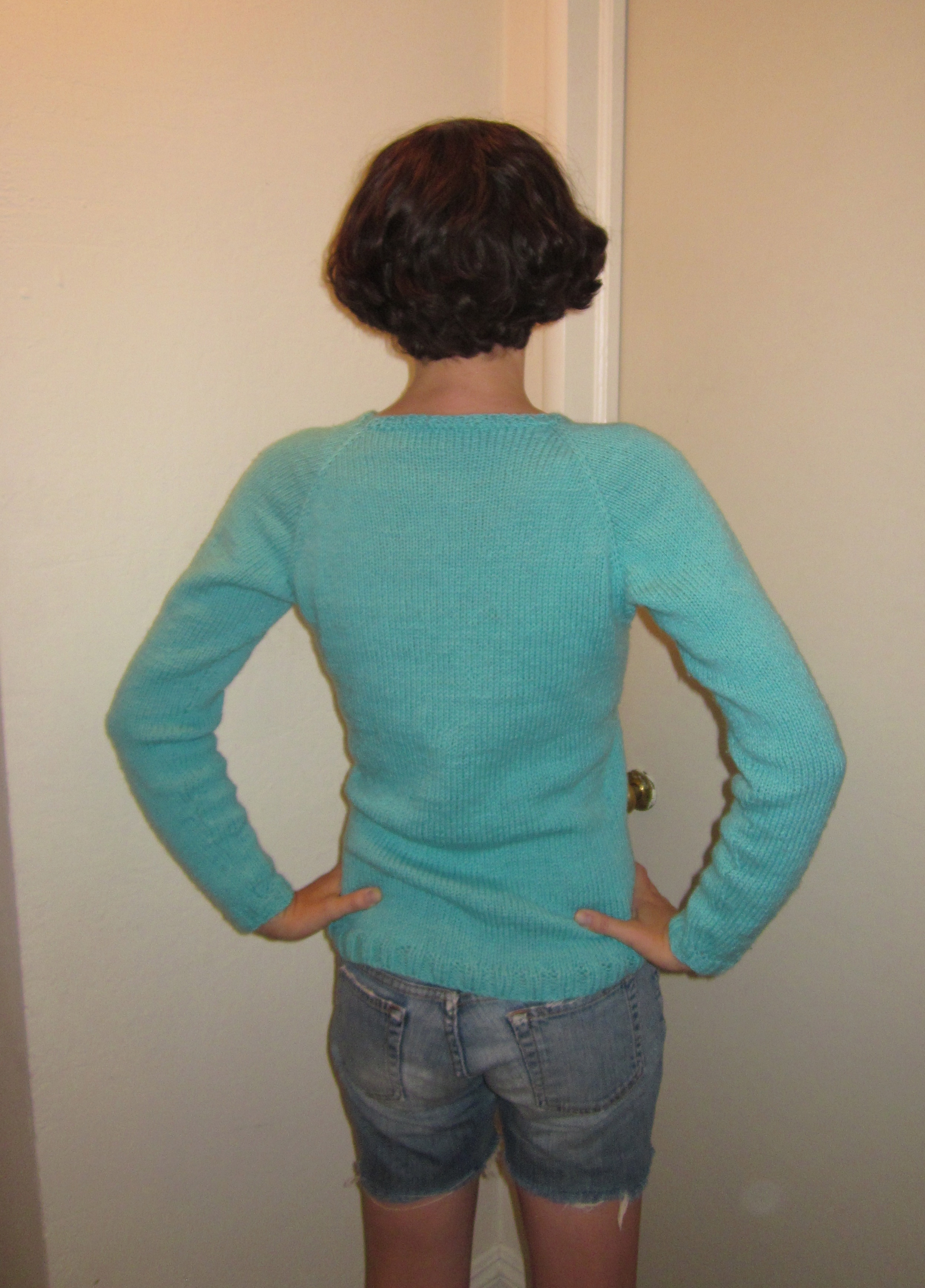 And here’s a view of the back of the completed sweater (ironically taken on a hot summer day, hence the shorts!)