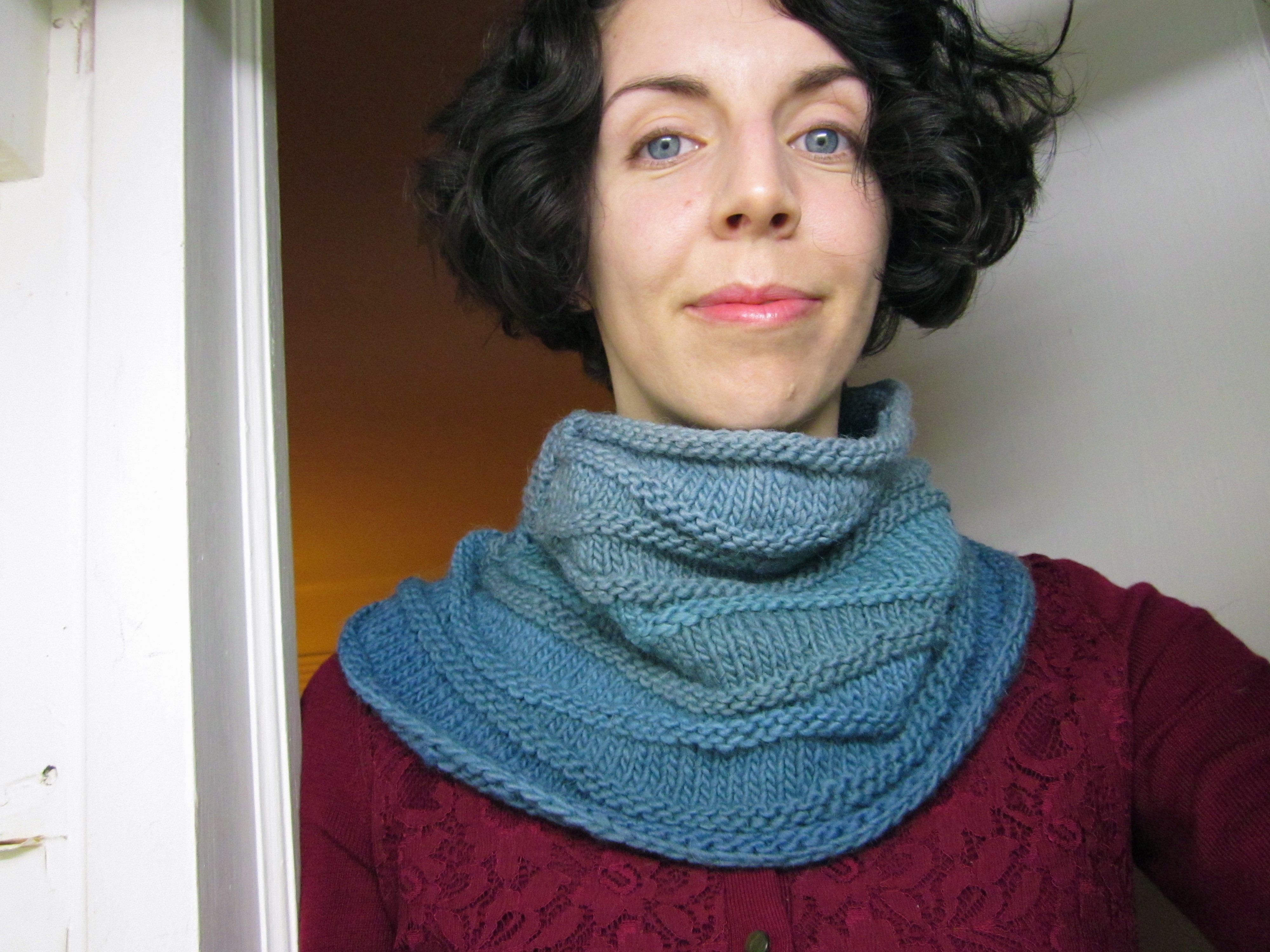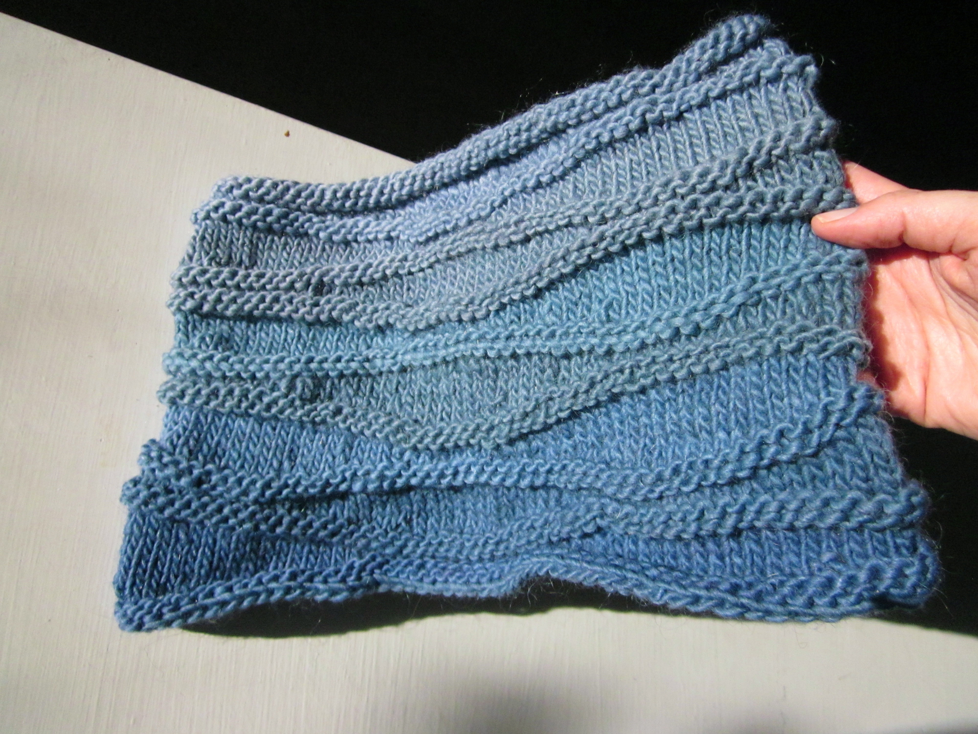 I made an ombre cowl from this blue yarn using this Wave pattern. Here it in 2012: