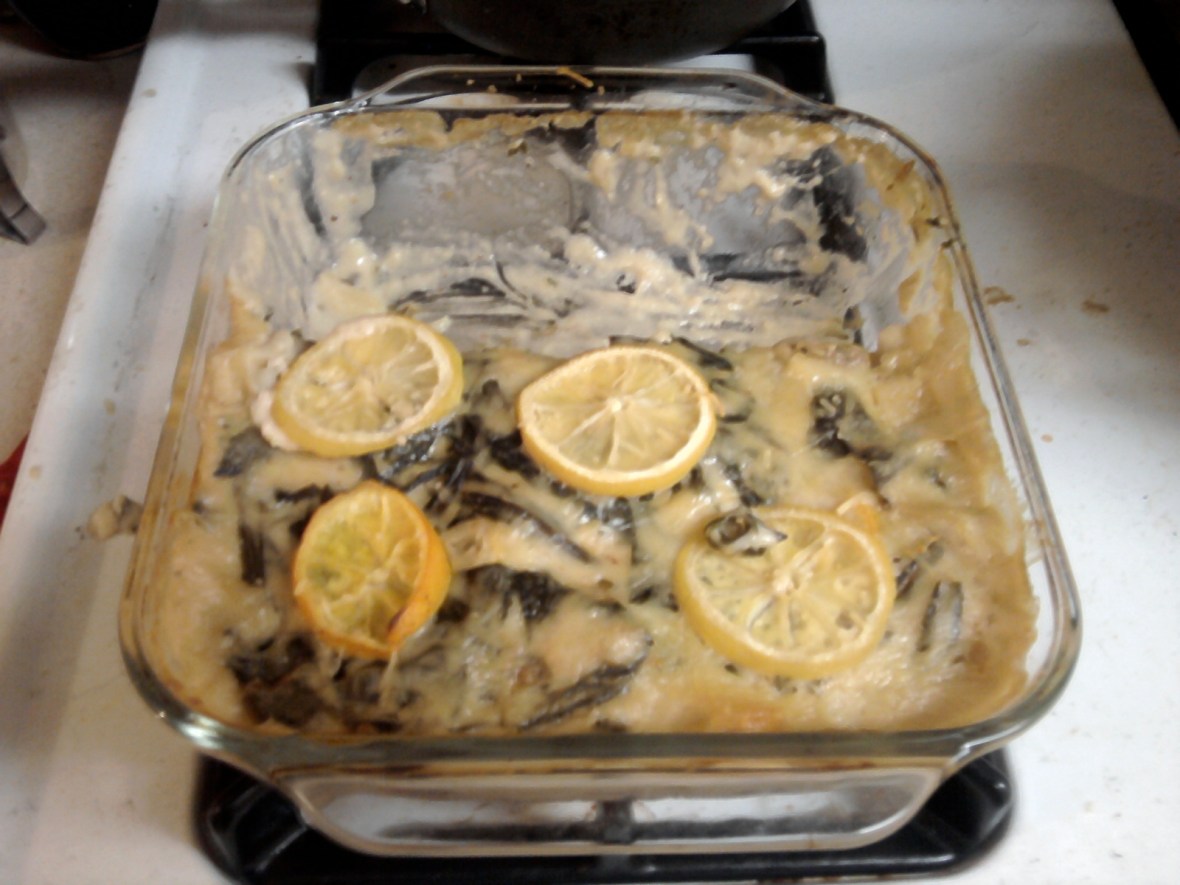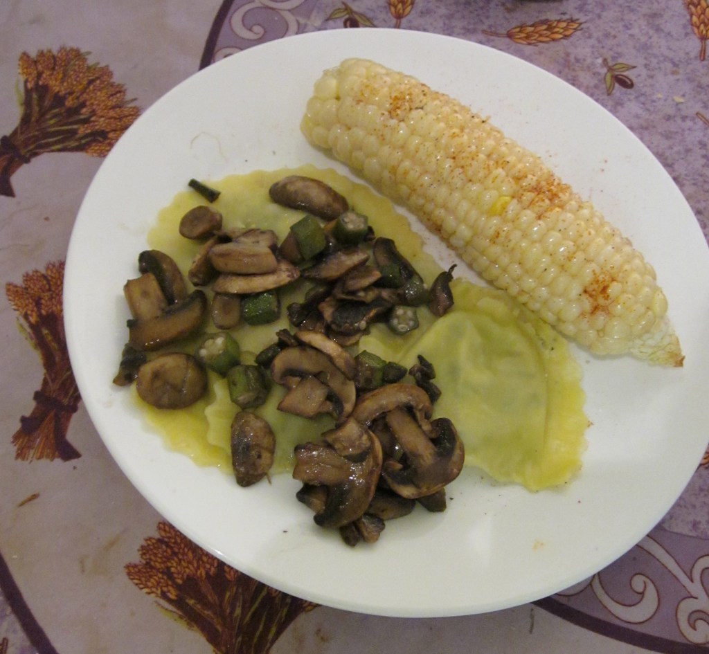 I ate it with some spinach feta ravioli and some sautéed mushrooms and okra (and yes, that is the red okra from the garden—since I only have a few plants, I often add it to whatever I’m cooking). Delicious.