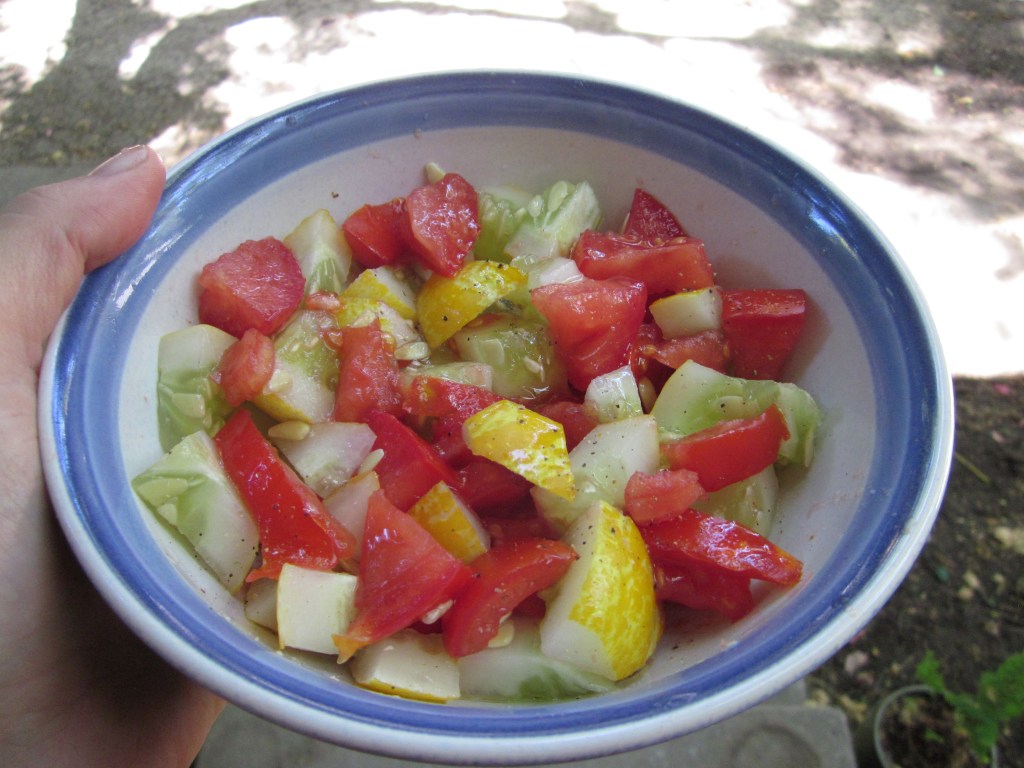 I have an embarrassment of tomatoes (especially big beef and shady lady) and a surprising number of resilient cucumbers (more lemon ones that Armenian). The easiest thing to make with them is this salad: