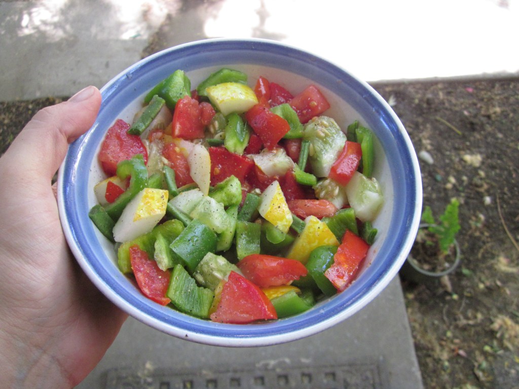 This is about as basic as it gets—cut up the tomatoes and cucumbers, add vinegar, oil, salt and pepper, and eat. It gets even better if you can chill it for like 30 minutes and let the vinegar soak in (but not too long—we’re not making pickles here). Any vinegar will work, but my favorites are rice vinegar and balsamic vinegar. I used rice vinegar in the version pictured. You can also add pretty much any other vegetable you that would eat raw in a salad to this dish, like bell peppers and green beans. Since my lemon cucumbers are yellow, this is why I think of it as “stoplight salad”: