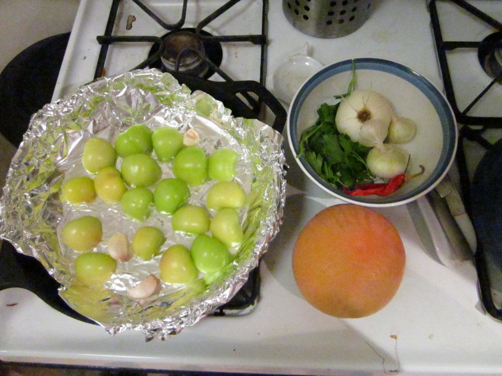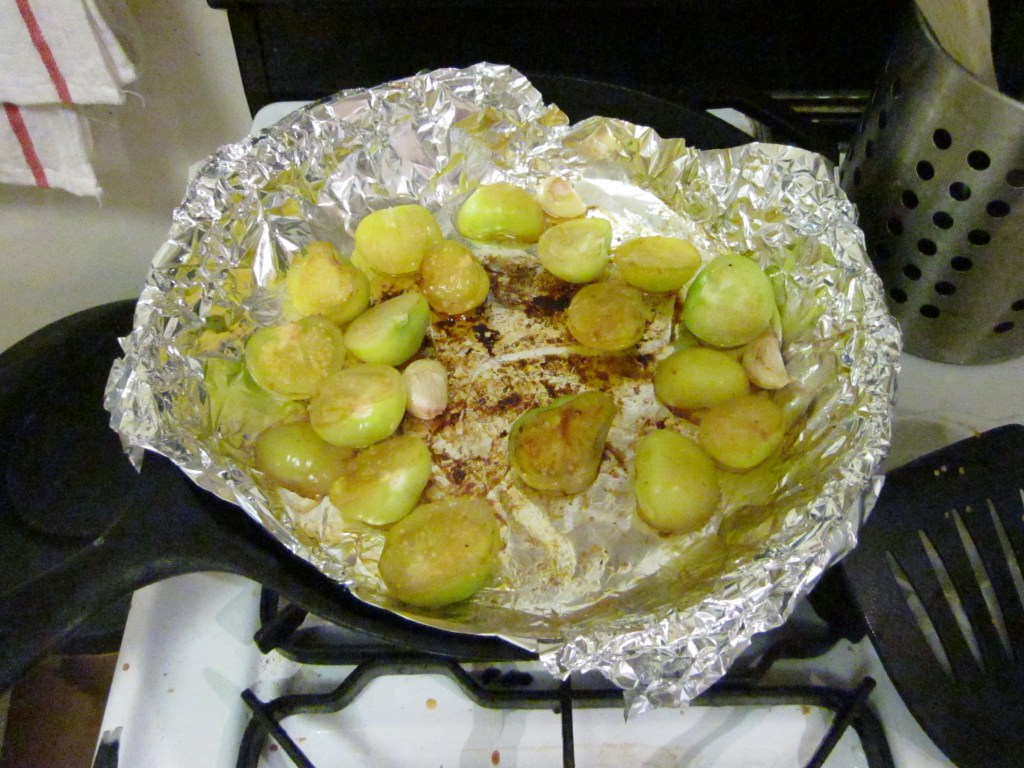 Using my cast iron skillet lined with foil, I roasted the tomatillos and garlic for a few minutes on each side, until they were a bit browned: