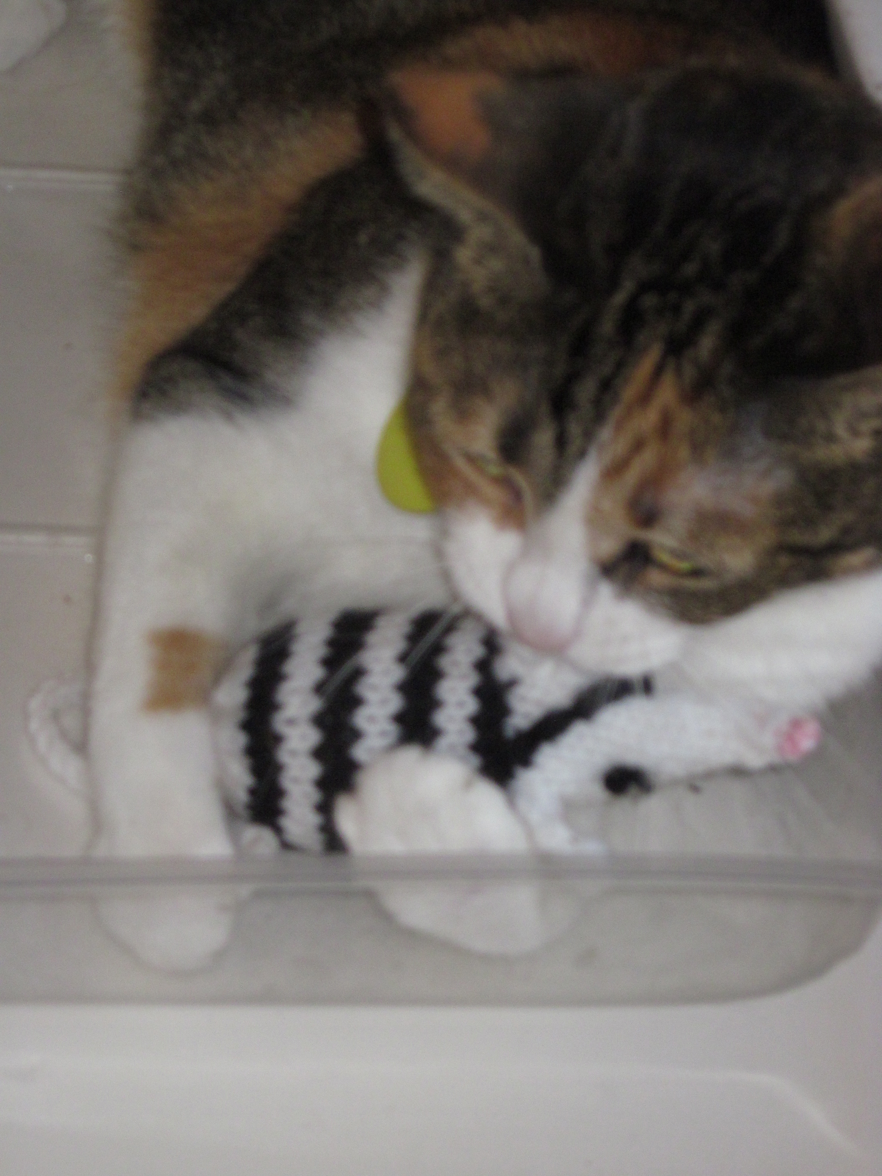 This is the Pretty Twisted pattern from Knitty’s first fall 2011 issue (free, of course). I made the “framed” version (the light teal one in their photo) and finished it with a two-toned wooden button.