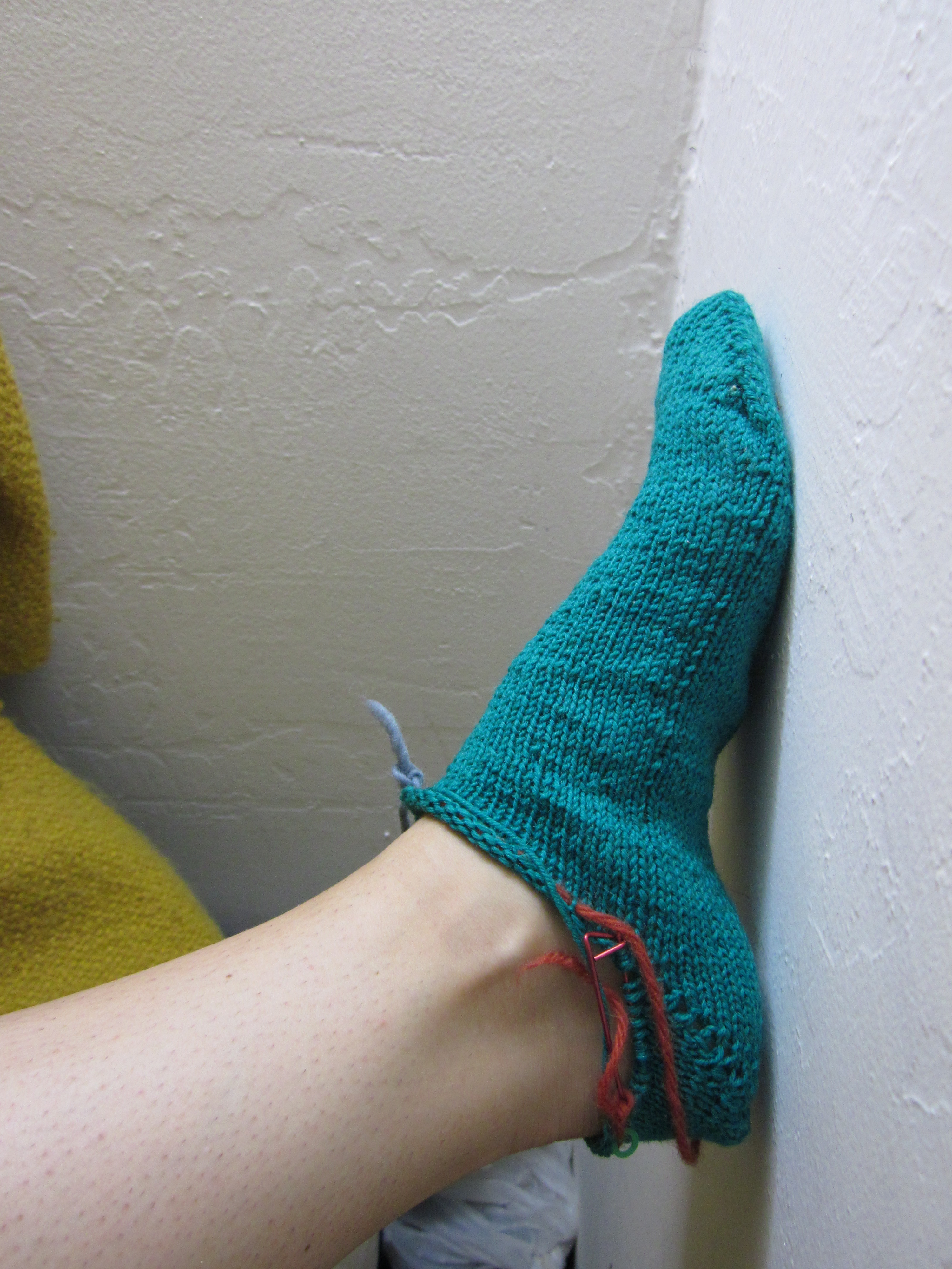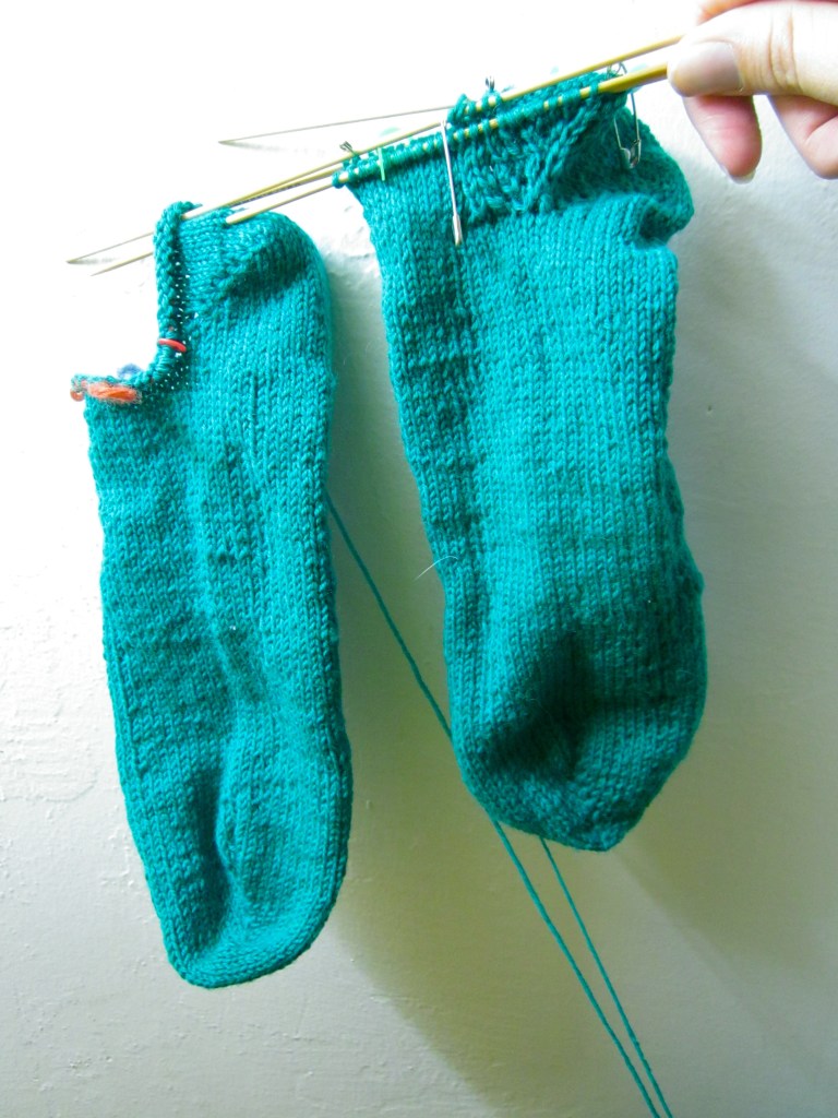 It is really difficult to photograph one’s own feet wearing socks…let’s just say you need some flexibility. Anyway, I’m quite happy with how they turned out. It’s difficult to do justice to this color, which a fellow knitter described as “peacock.” It is quite vibrant, and looks either more green or more blue depending on the light.
