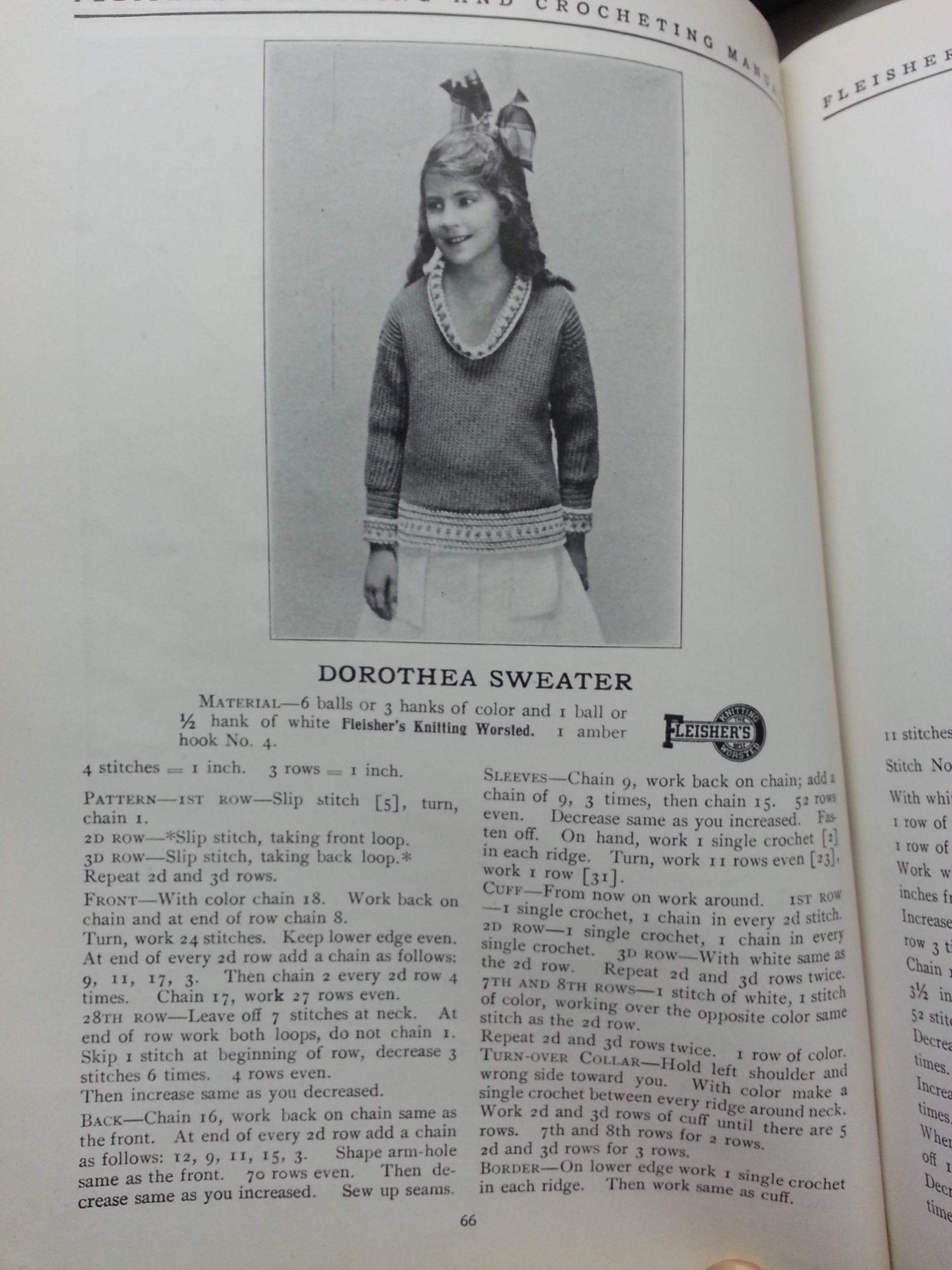 One of the interesting things about this Fleisher’s Manual is how many crochet patterns it had. Northwoods is a boy’s cardigan done in crochet with a worsted weight wool yarn. I think every detail of this sweater is nicely done—the pockets, the cuffs, the shawl collar.