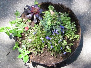 I added this little guy to my porch—and it has kept surprisingly well through the heat of summer. The lobelia died back, but the snapdragons and the many succulents are doing quite well. I really like mixing in succulents with regular plants instead of separating them. I’ve found several new succulents in pots that people have tossed into greenwaste piles—I salvaged those and saved the pots from neighbors who moved away, so hopefully there will be more interesting succulent combinations in my future.