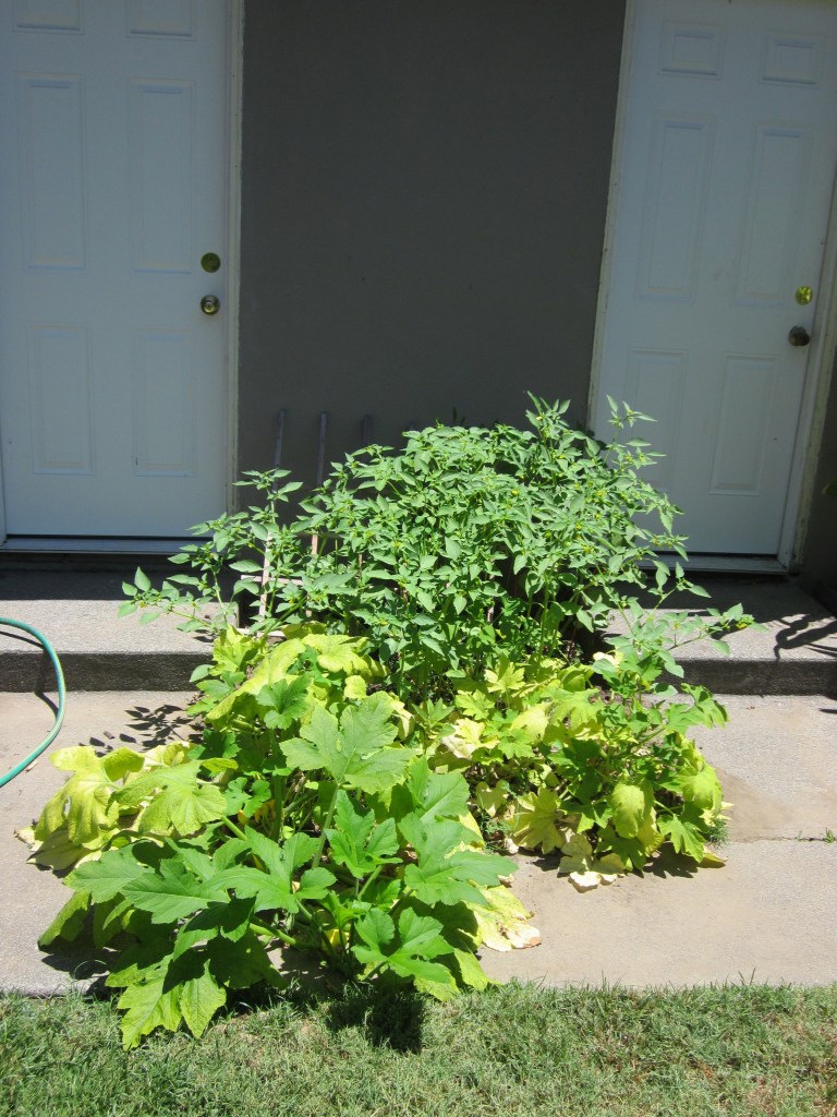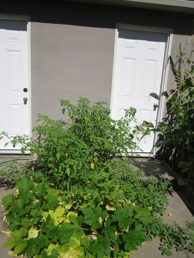 By early July it had a crapton more—bell peppers on the left, heirloom tomatoes on the right, cherry tomatoes (sungold?) in the back, and a couple of volunteers—tomatillo (of course), sunflower, and some unidentified cucurbits. But aside from the bell pepper plants (which all came pollinated—a late purchase I got for the grand total of 70 cents), nothing was fruiting because I planted it so late.