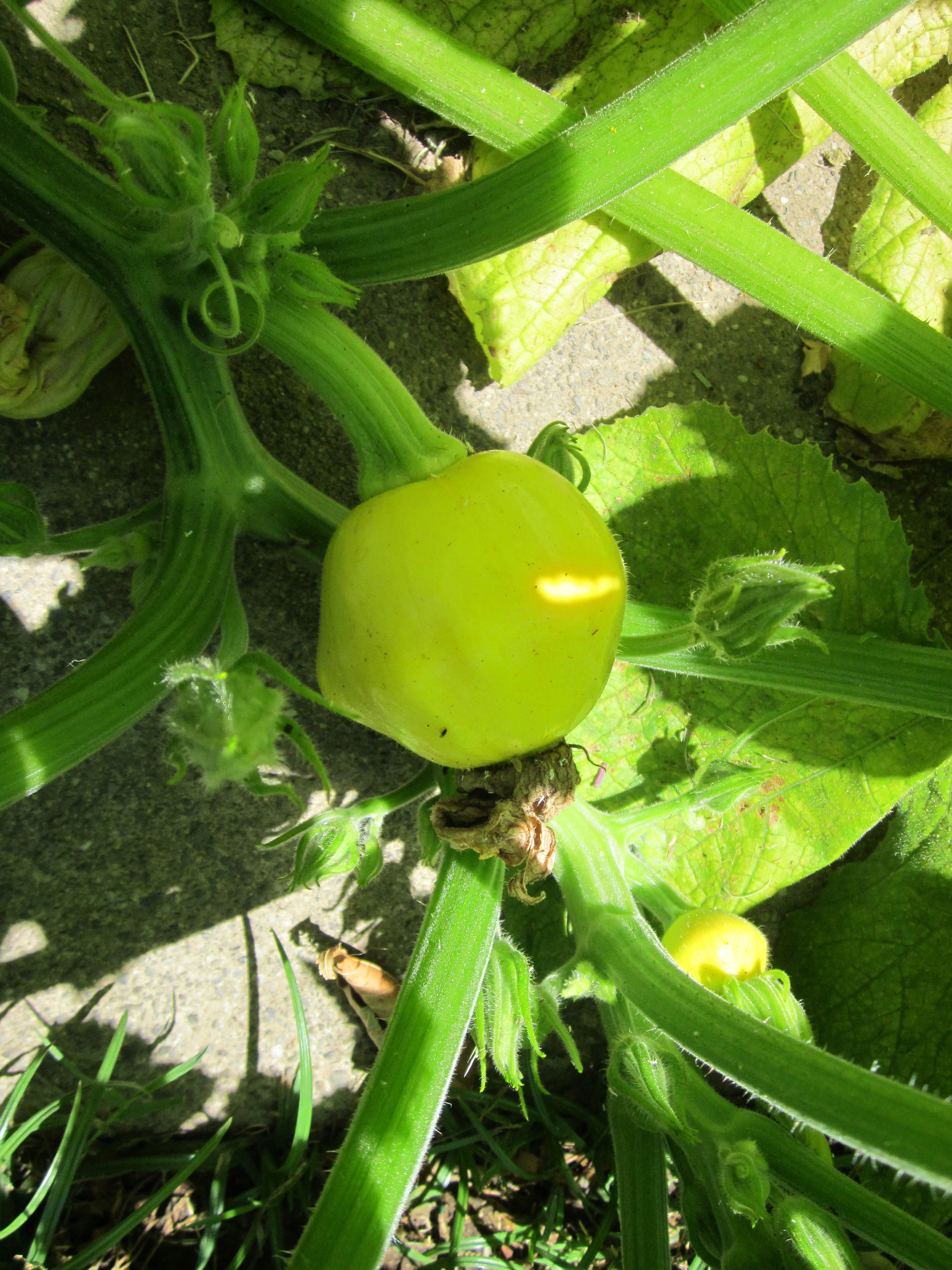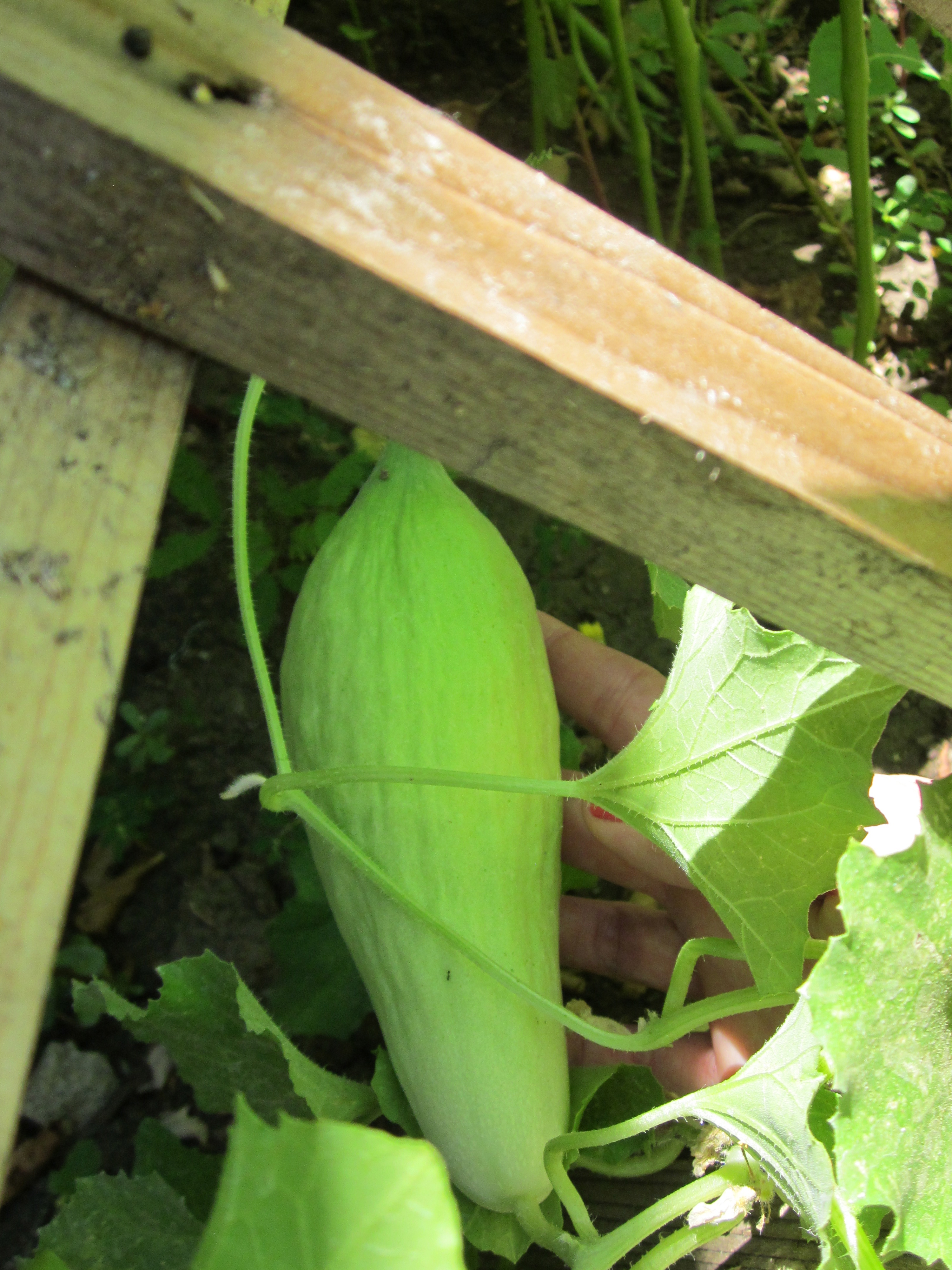 So this quickly became the plot dominated by tomatillo and squash plants. I could do without the tomatillos, but I was looking forward to yellow scallop squash, and cukes. Just check out these guys: