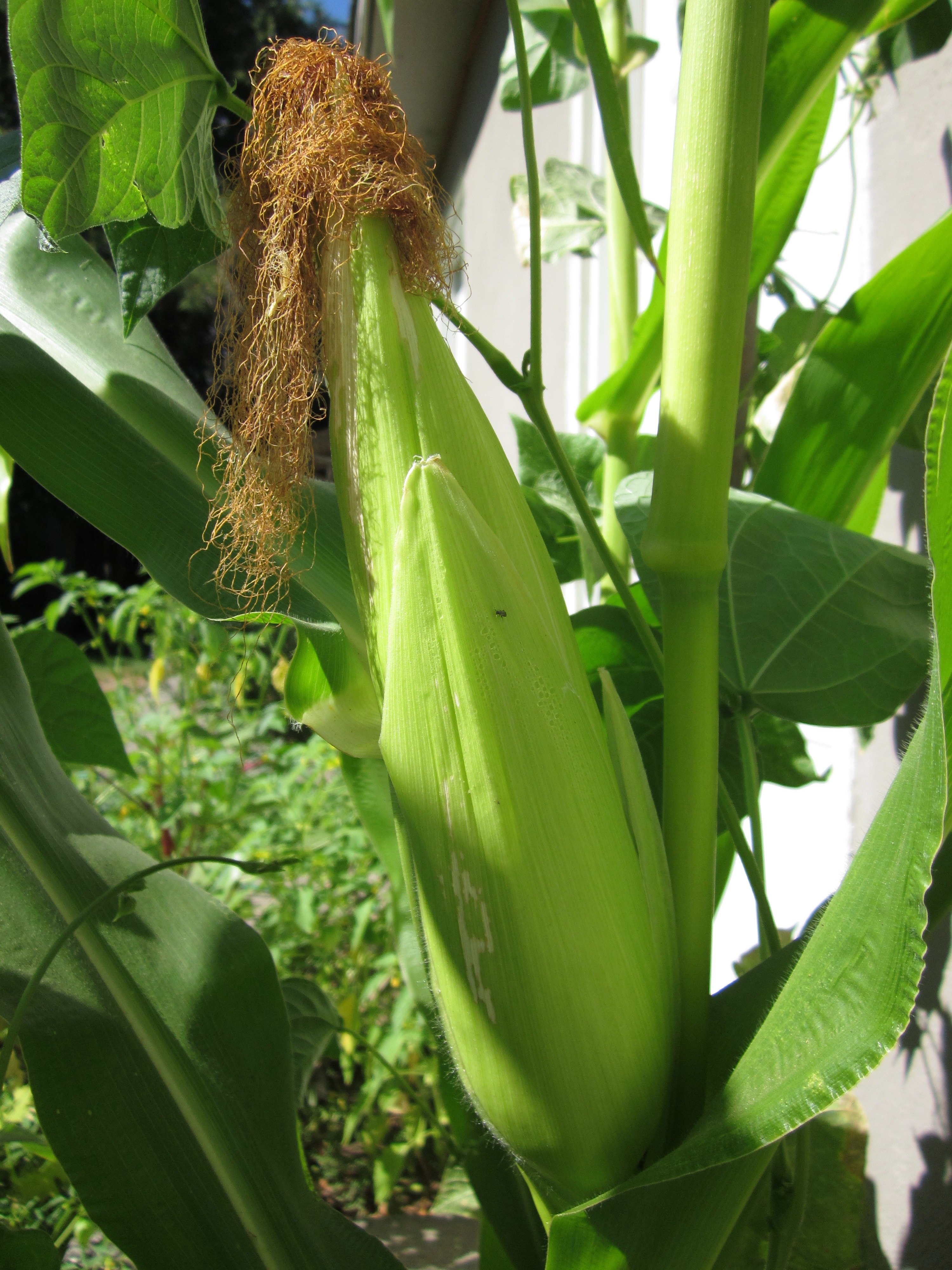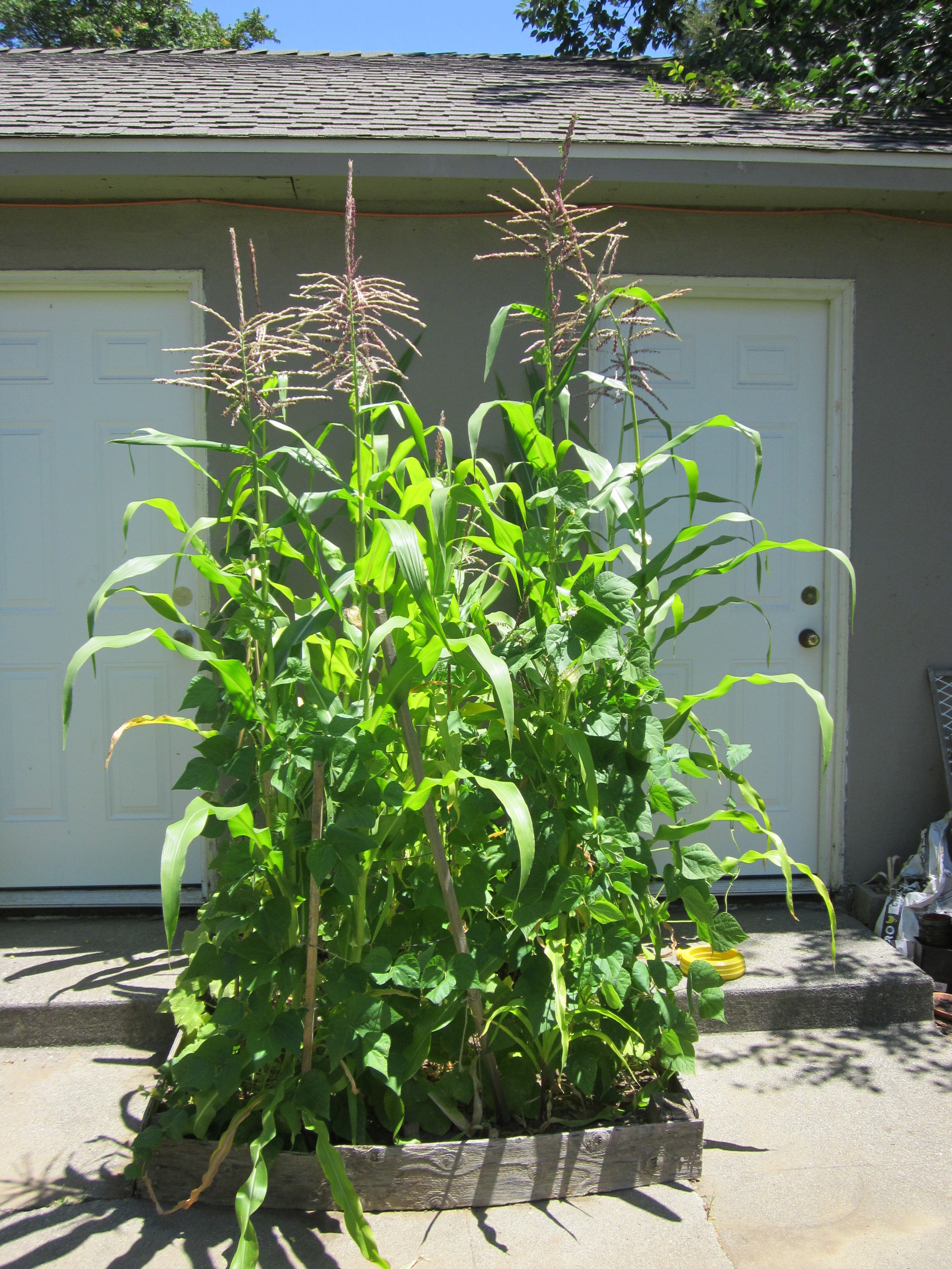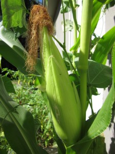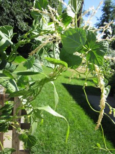And then the winds came. Like most of the country this year, I am having trouble with my corn—but instead of a drought, I am battling the winds. I thought they’d be a good thing, considering corn is wind pollinated. But I have had to prop the corn up twice—in either direction. I’m not sure how many of the stalks are still fully intact, because I don’t want to battle the vines to find out. On the one hand, I am finally getting green beans. On the other hand, their weight is making the corn situation worse.