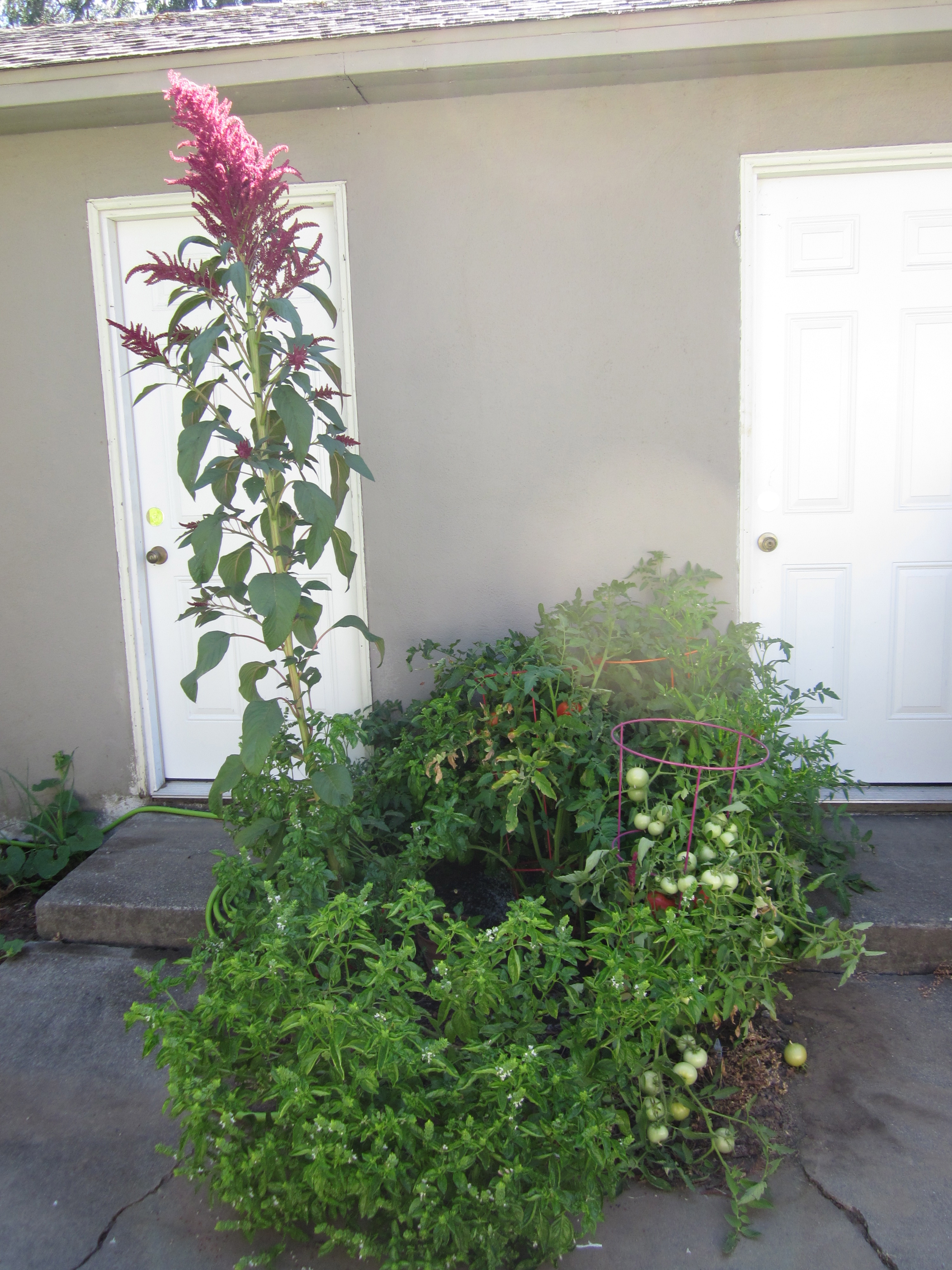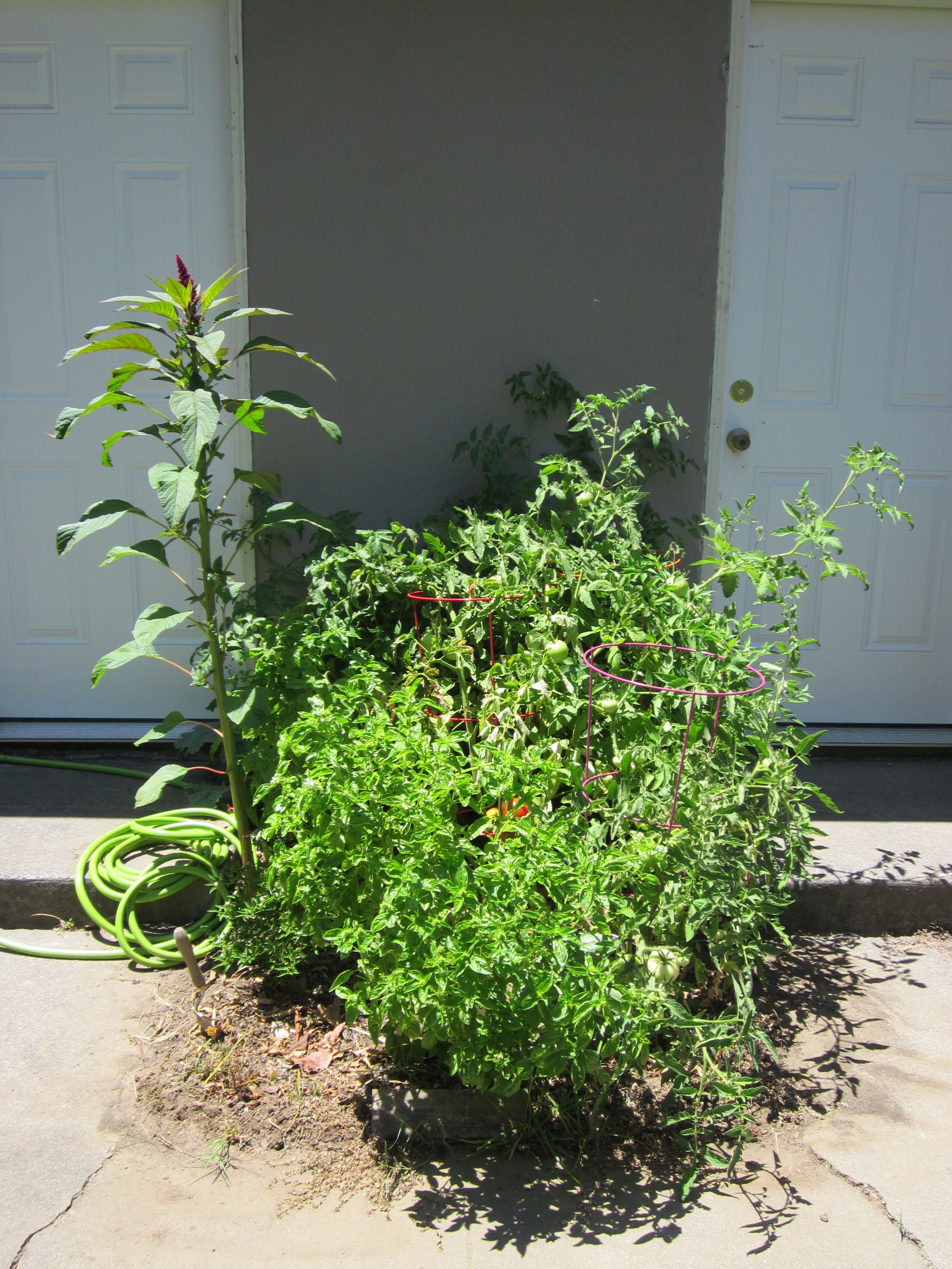 Here’s the first plot a few weeks ago. Not too bad, right? You can just see the first red tomatoes peaking out in the middle, and the basil is doing well.