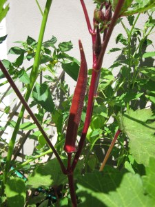 This is my first and so far only okra pod, but it looks like a few more are on the way. I hope they get big enough so I can cook them all at once!