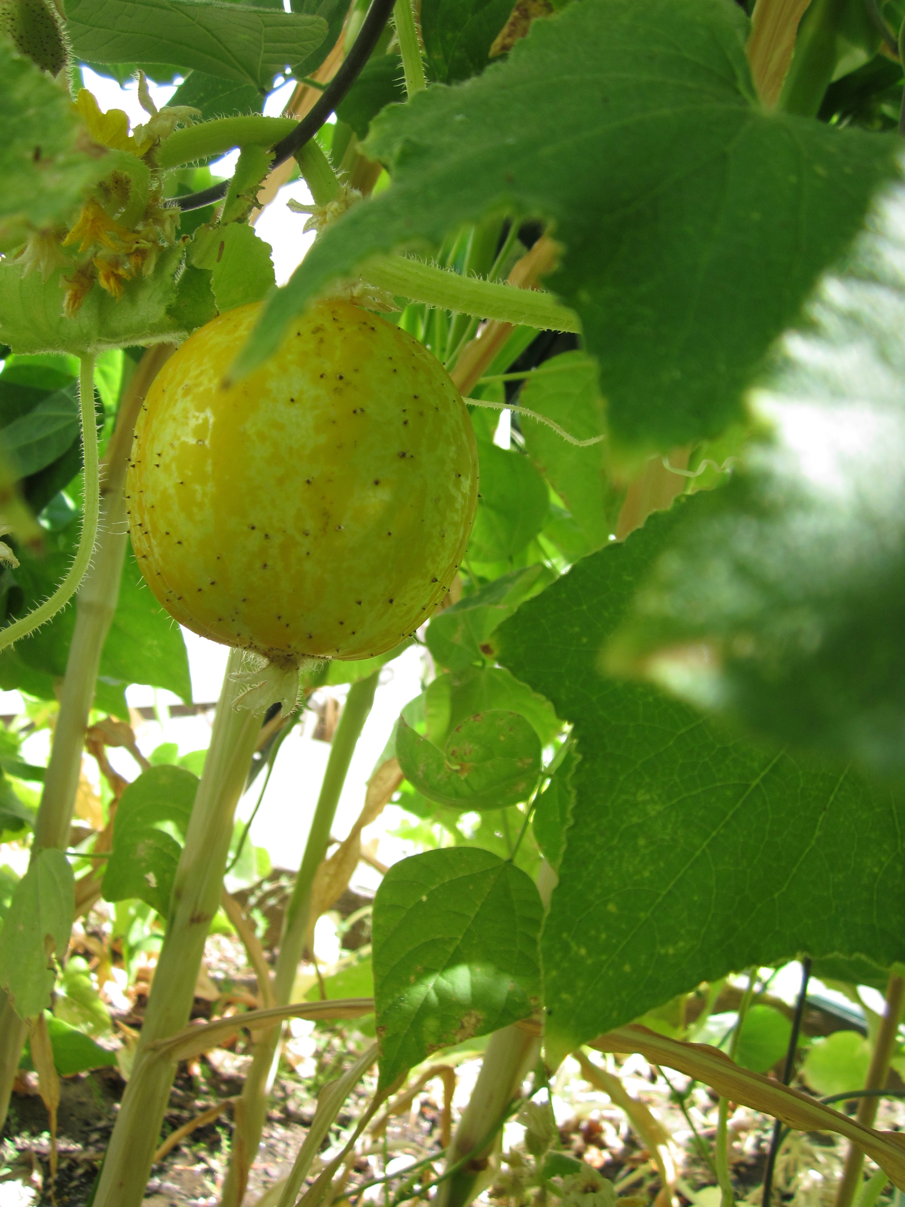 Now this plot is finally looking nice! Sunflowers and naked ladies (the pink flowers), and some fruits on the tomato and the cucurbit.