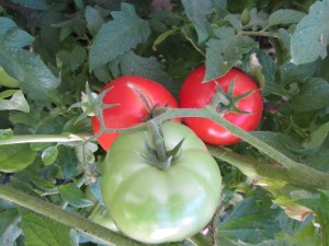 I think the green zebra (with stripes) will be ripe soon—true to their name, they only get a yellow blush with green stripes. The Kellogg’s breakfast supposedly will turn orange. So far, so good for this plot. Except for the beetles.