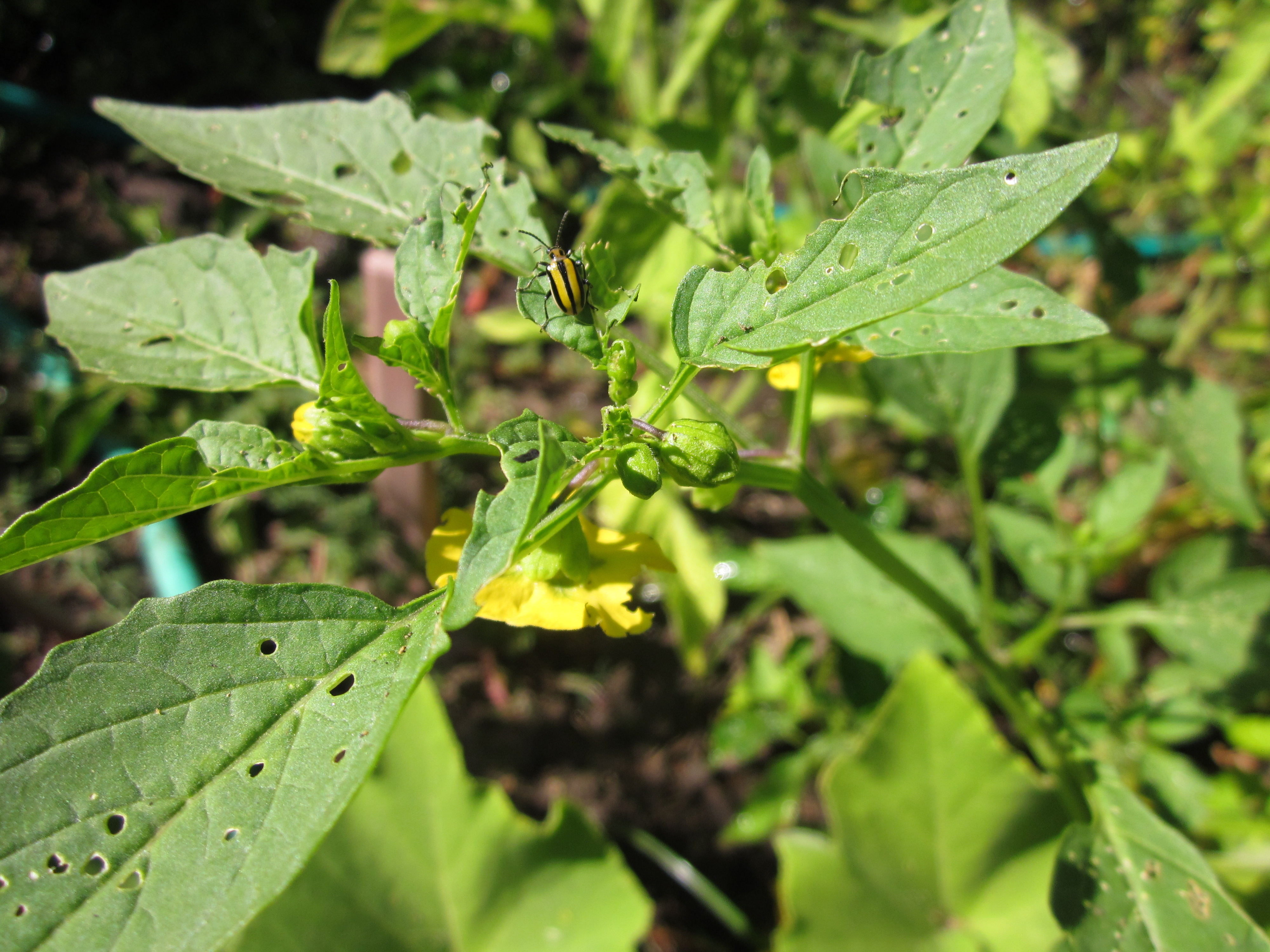 Despite their name, these striped cucumber beetles are having a field day with the tomatillos. There were some in the other plot, but these were absolutely infested. I guess I should be happy that they’re mainly attacking a plant I don’t much care about, right?